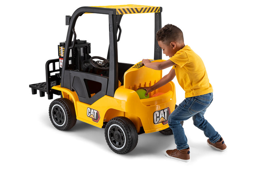 Grab your blueprints and don your hard hat, major construction fun is on the way with the Cat® Forklift Ride-On Toy by Kid Trax. This kid-sized forklift is perfect for sidewalk, driveway, or backyard construction fun. Features include working lights, sound effects, and of course, a real working forklift that can lift up to 15 lbs! It even comes with a toy hard hat and pallet for your little builder. Real foot pedal acceleration creates a lifelike driving experience, while the max speed of 3.4 MPH offers the perfect balance of fun and safety. Plus, Power Trax rubber traction strip tires keep the ride smooth and steady. The Cat Forklift also includes a 12-volt rechargeable battery and charger so the fun never has to stop for long. Playtime gets a big lift with the Cat Forklift by Kid Trax.
