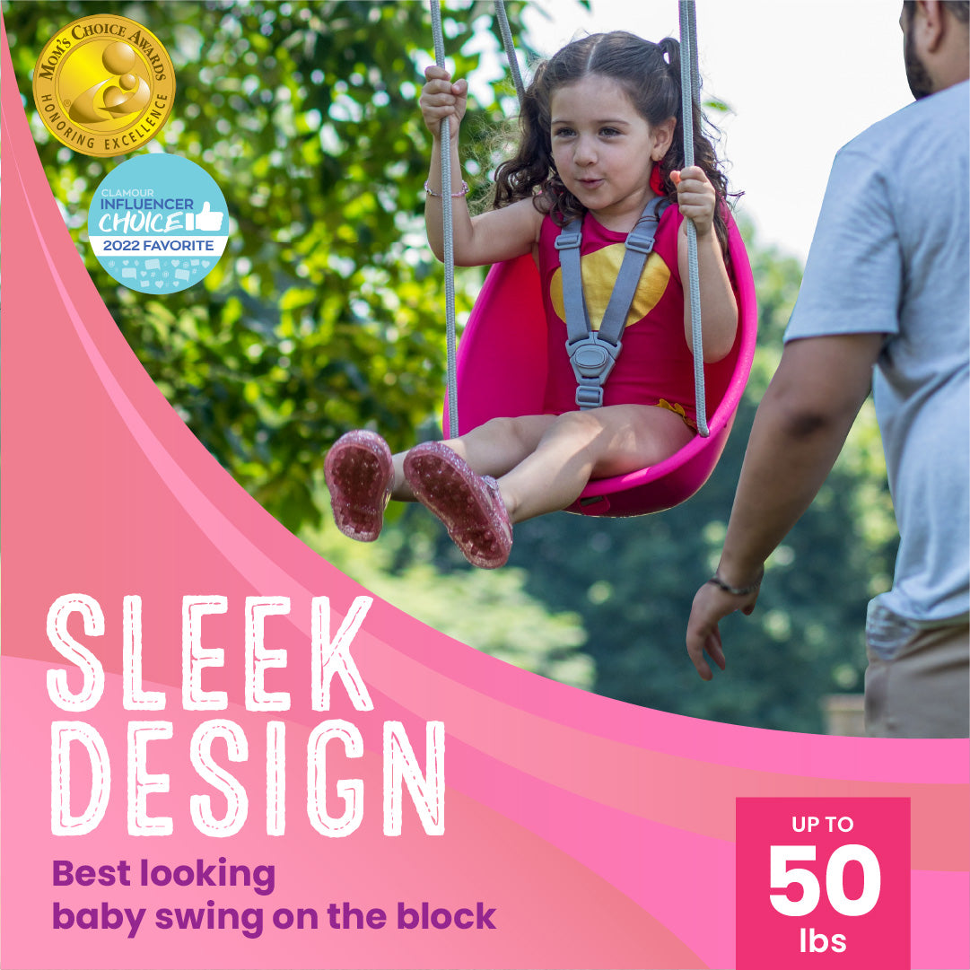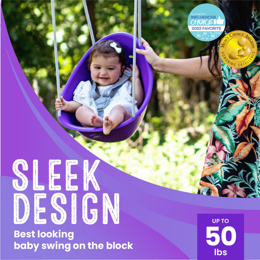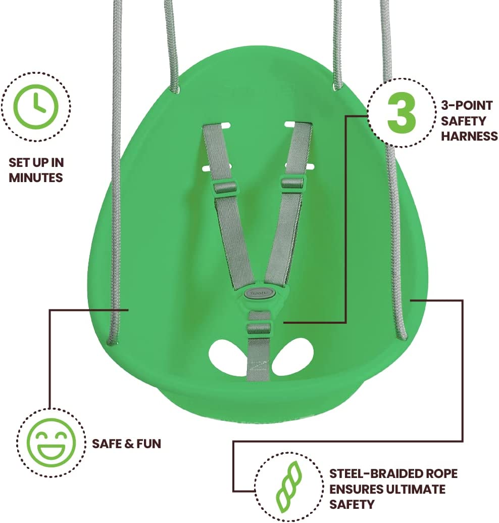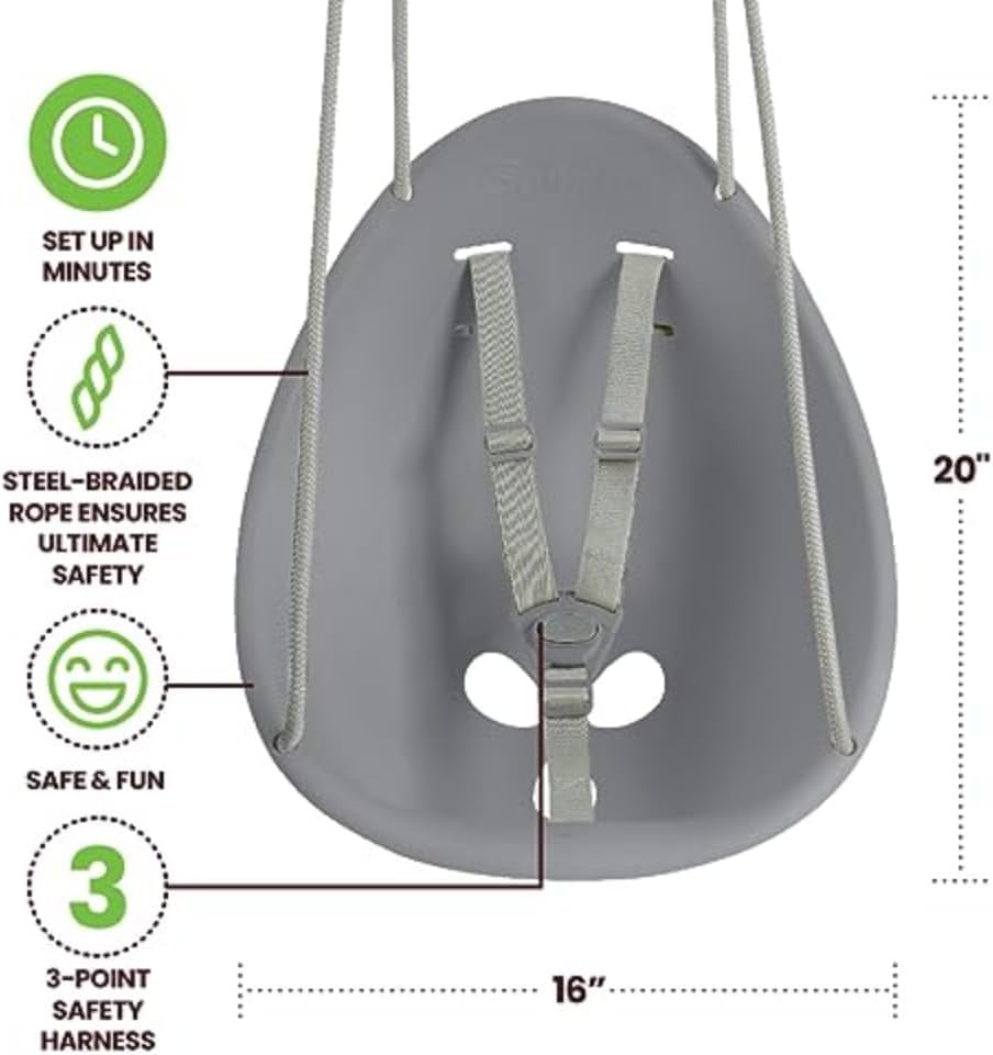 The Coconut is the perfect first baby swing, rivalling the ever popular Little Tykes toy swing. You will love this safe, stylish, modern shell that perfectly conforms to your child’s natural body curvature. Features a 3-point safety harness and heavy duty double-braided rope.