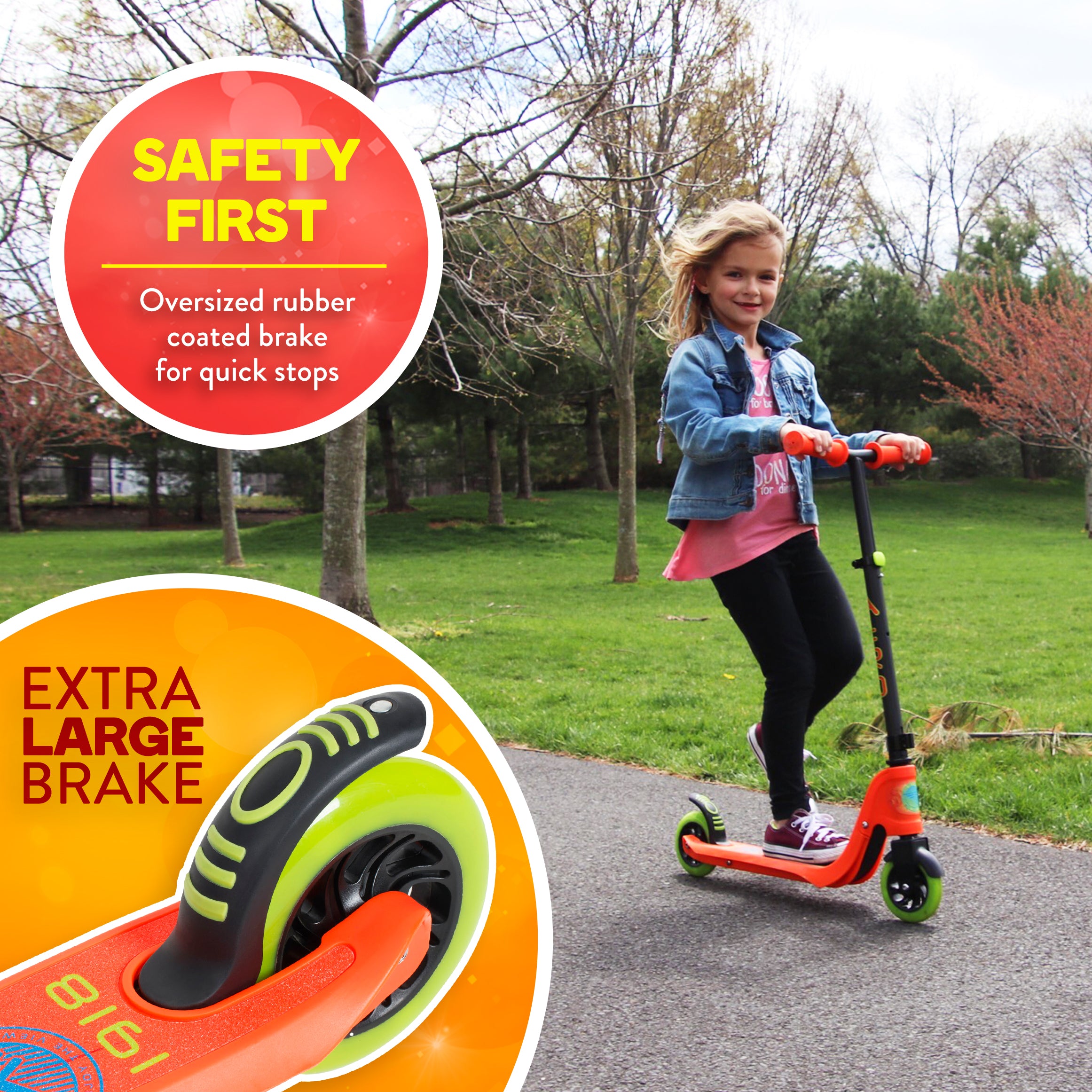 The Aero 2 wheeled scooter features a large, steel rear foot brake for a quick, safe and easy stop. Both wheels also light up while you are riding!