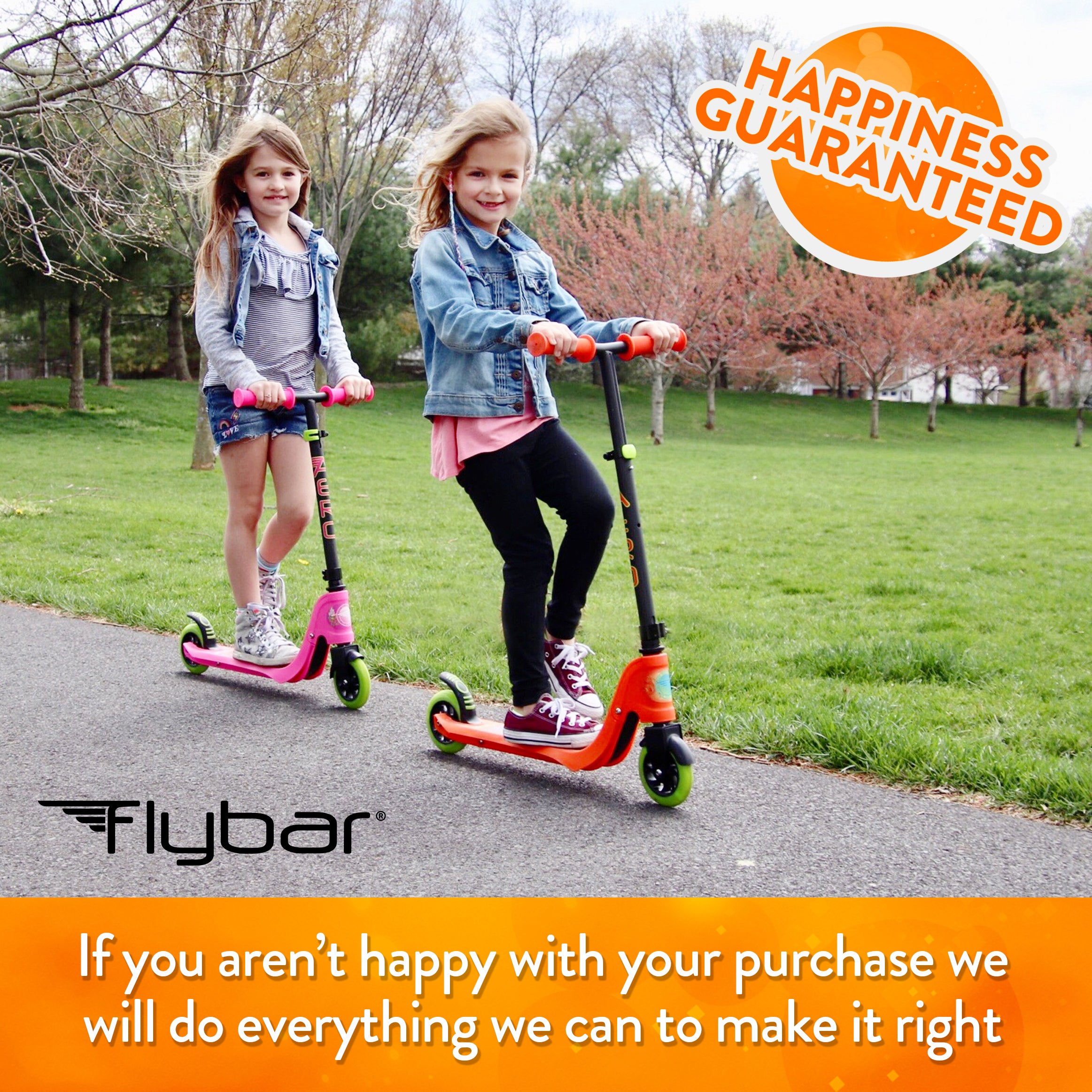 Comfortable Flybar handle grips with adjustable to handlebars to accommodate smaller and larger children with settings for 27.5” and 32”. Unique and colorful grip tape ensures maximum stability and control while giving the scooter a cool look! Available in blue, orange and pink featuring their own unique grip tape design.
