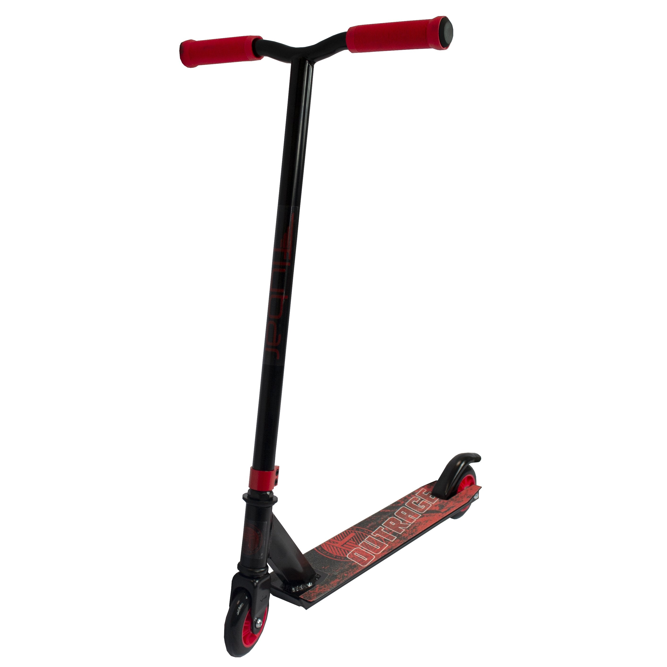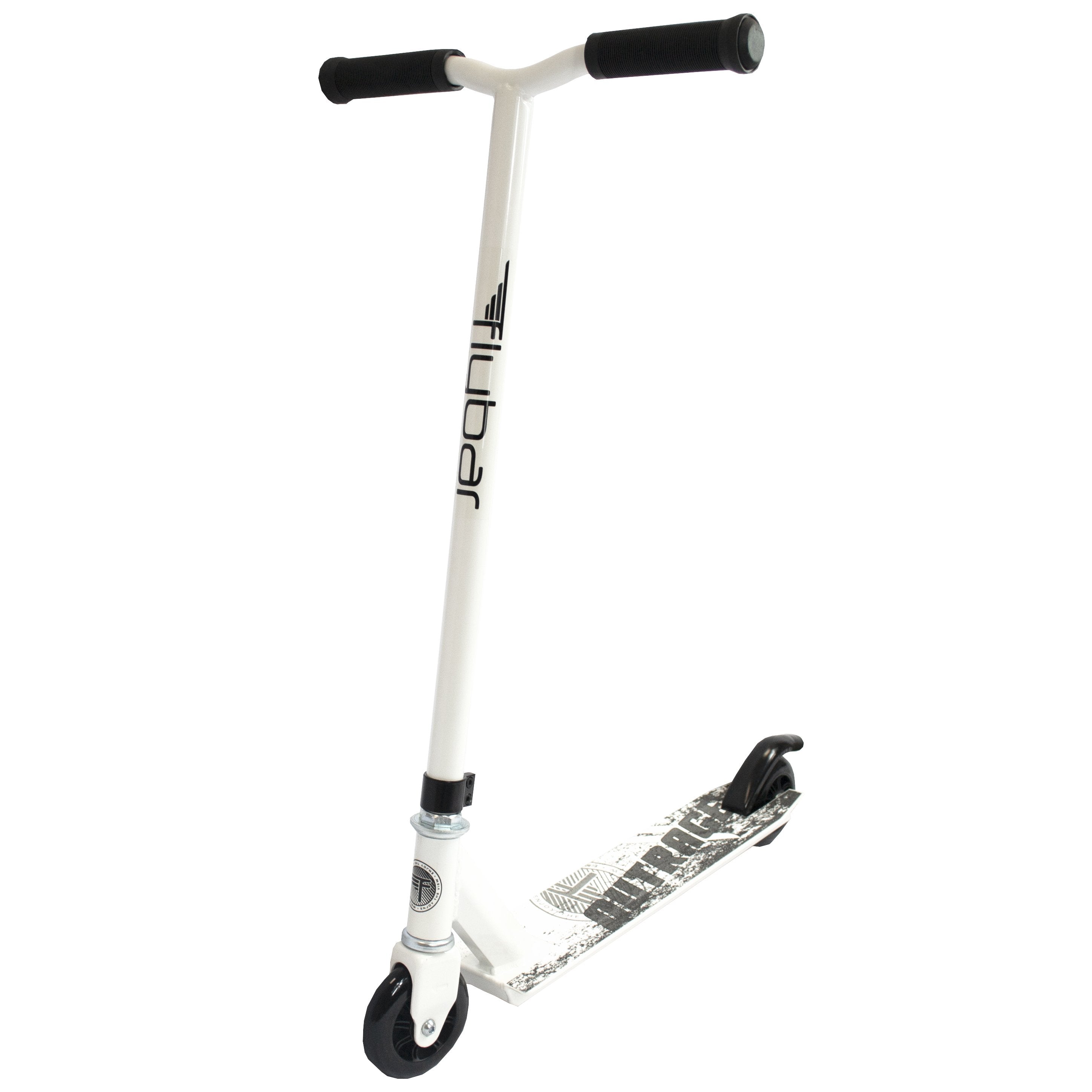 The NEW Flybar Outrage Pro Stunt Scooter features a strong robust deck together with a reinforced fork, one piece aluminium T- handlebar and dual screw clamp. Check out the Outrage Pro Stunt Scooter in Black or White distressed graphics deck. There is plenty to get excited about the Outrage Pro Stunt Scooter! Rolling on 100x 24 mm PU wheels with ABEC 7 High Speed Bearings, the ride quality is smooth. Full length custom graphic grip tape and comfort rubber handlebar grips give plenty of stability. Stopping power comes from a low profile yet lightweight foot brake. Take the Outrage for a spin – or let it spin you!