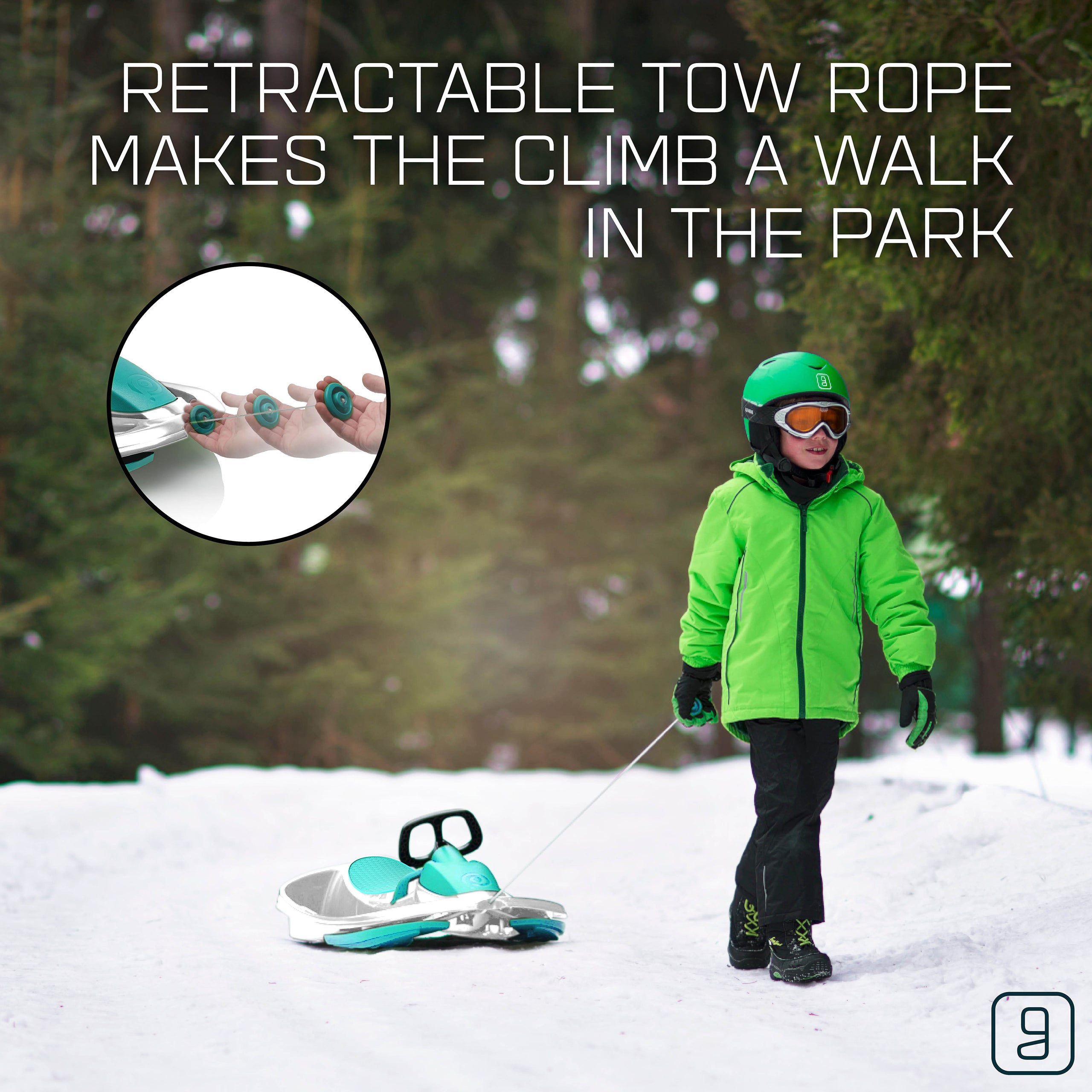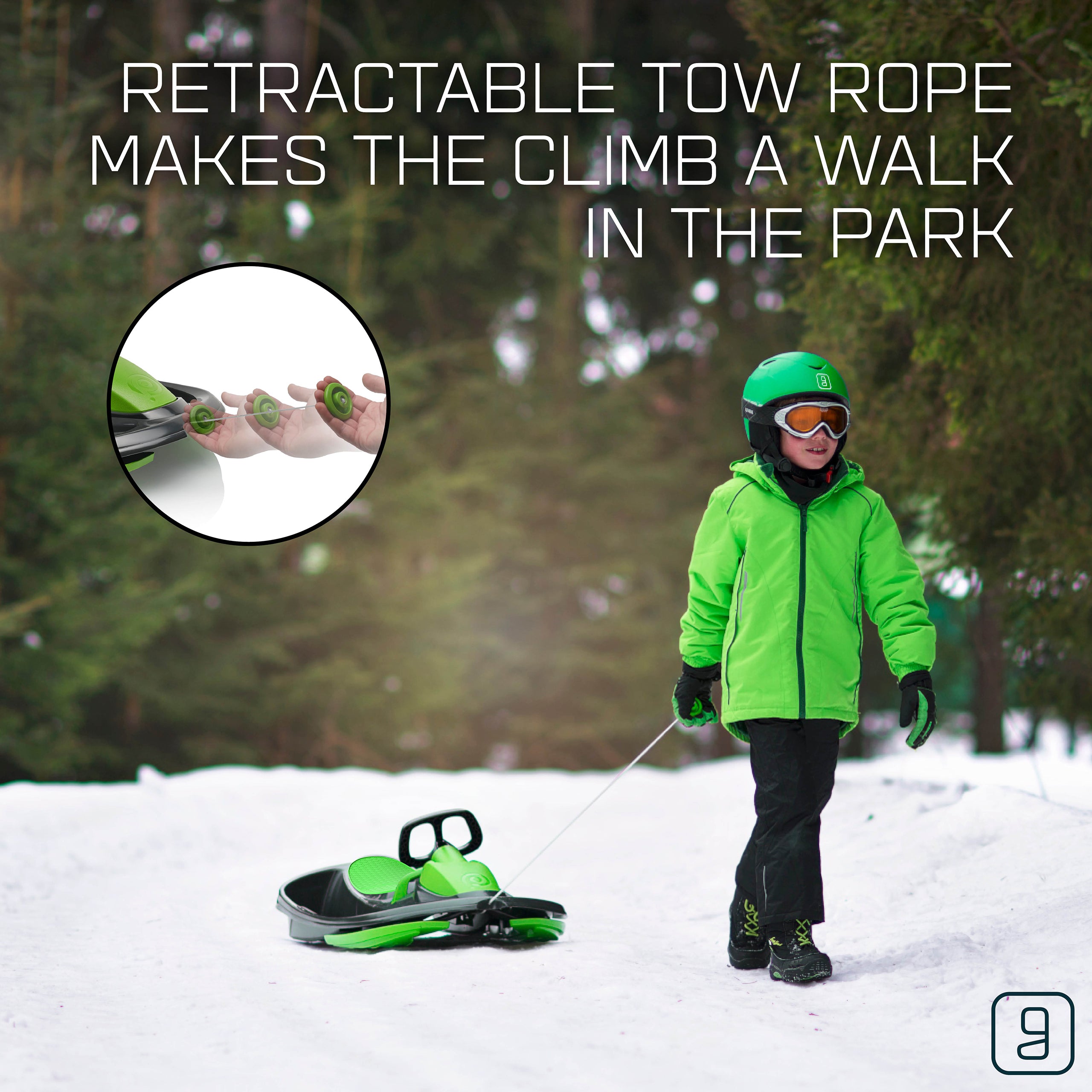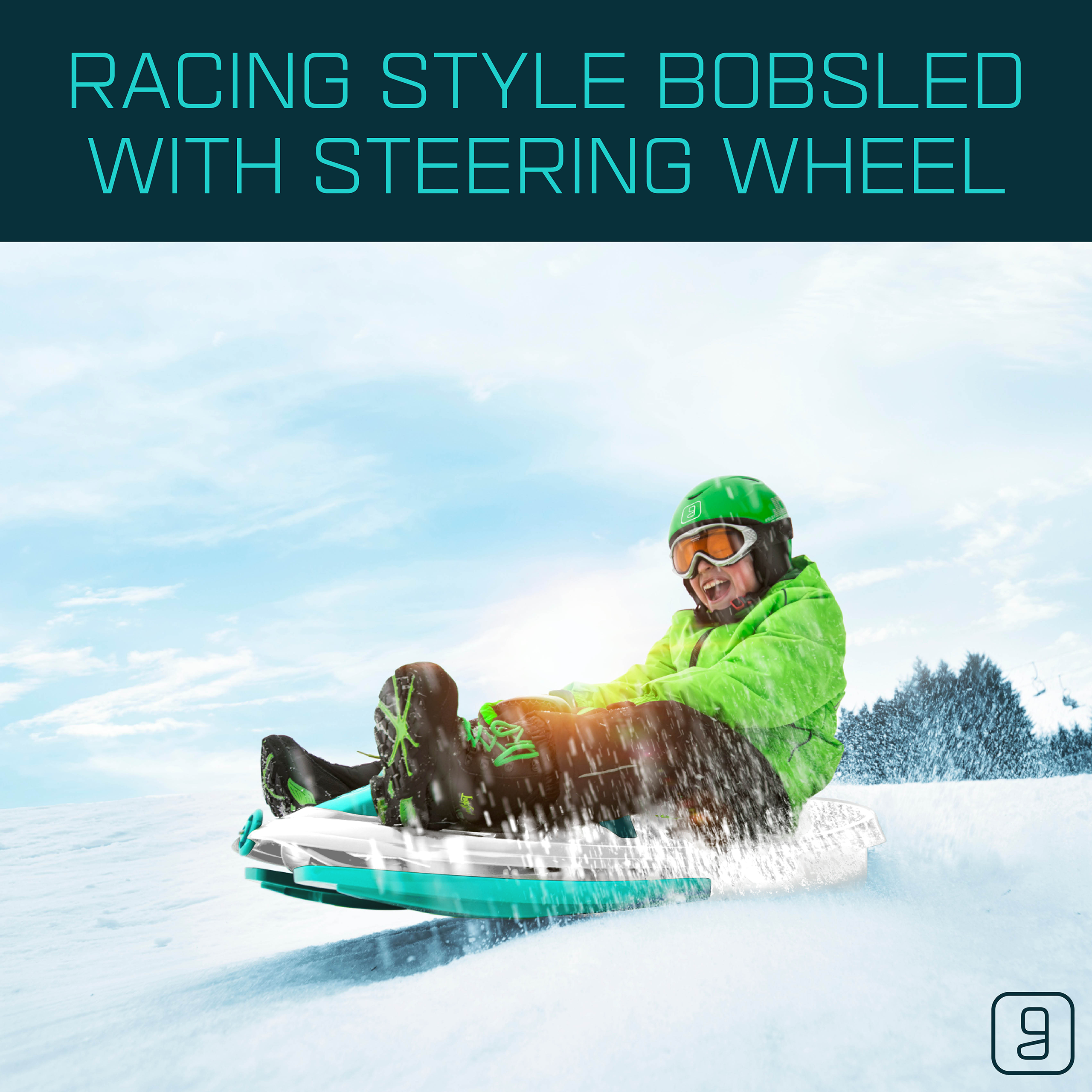 The Gizmo Riders Nimbus snow bobsled for kids can fit up to 2 riders and has been built with speed and handling in mind. The Nimbus bobsled features a steering wheel connected to a locking differential steering system that provides the Nimbus with the ability to maintain high speeds during turns in winter conditions and features a spring-loaded brake that can be activated by simply pulling the brake handle. The Nimbus sled is easily assembled with no tools as each of the parts snap together and securely lock into place. Also featuring a retractable tow rope and anti-slip plastic seat, the Gizmo Riders Nimbus is a fun and exciting snow sled for kids ages 3 and up!
