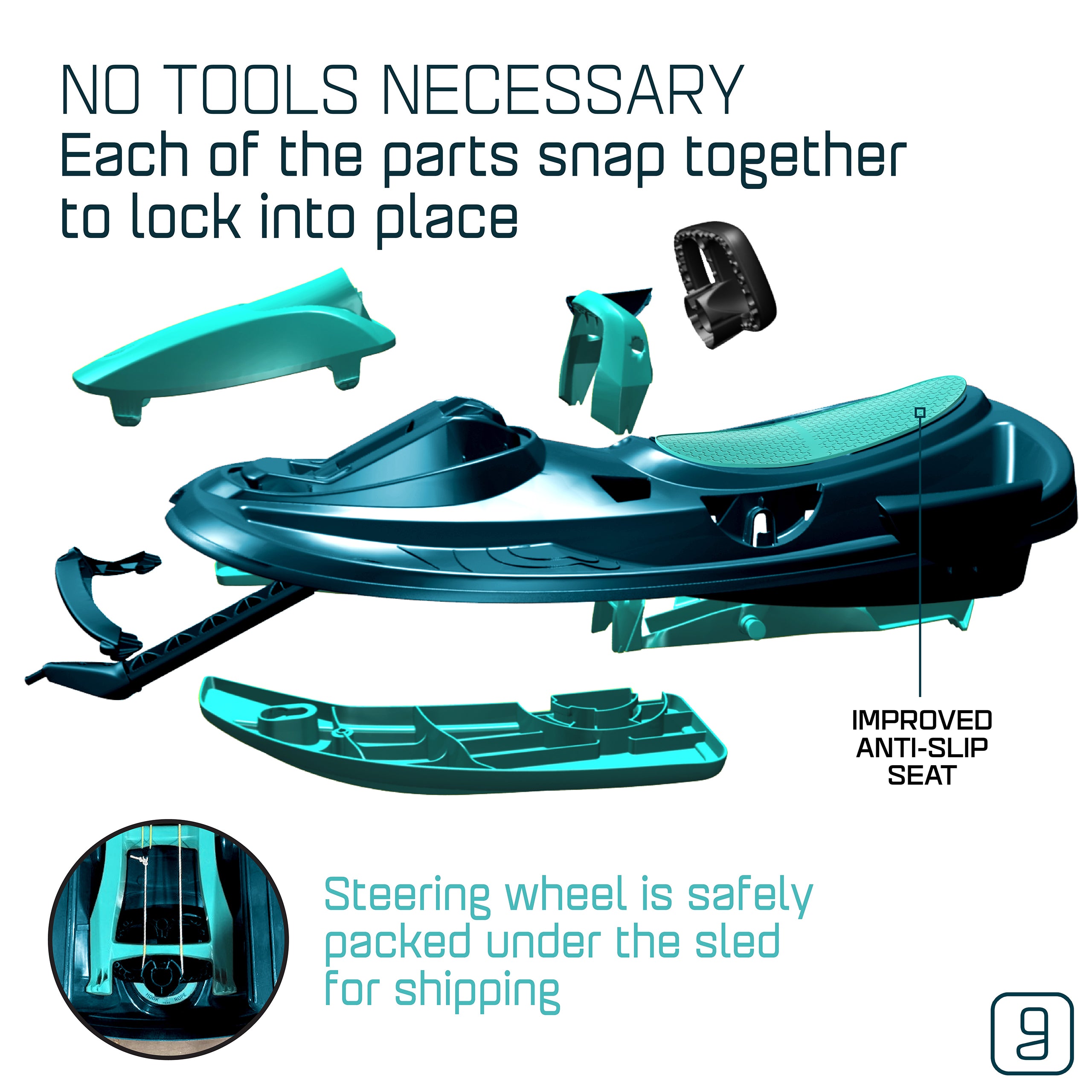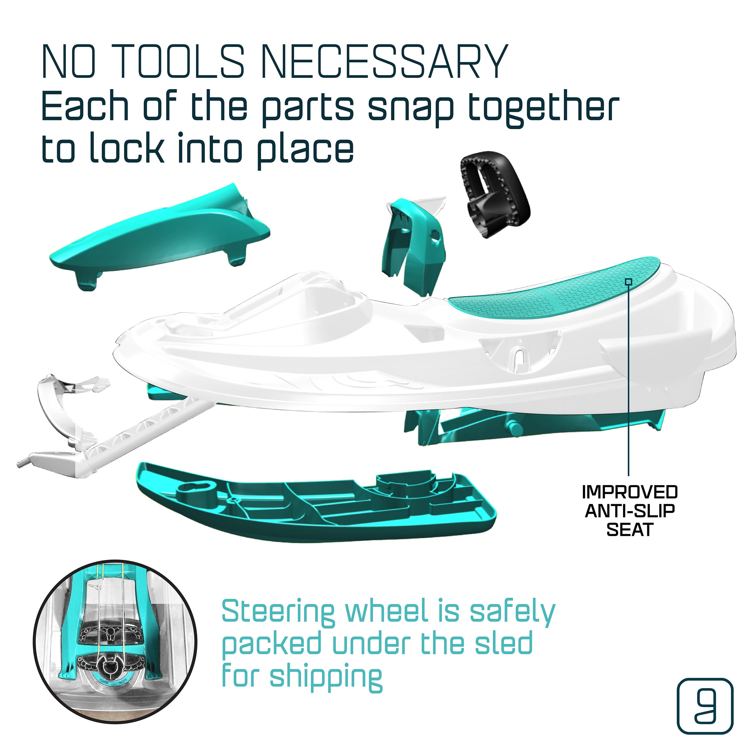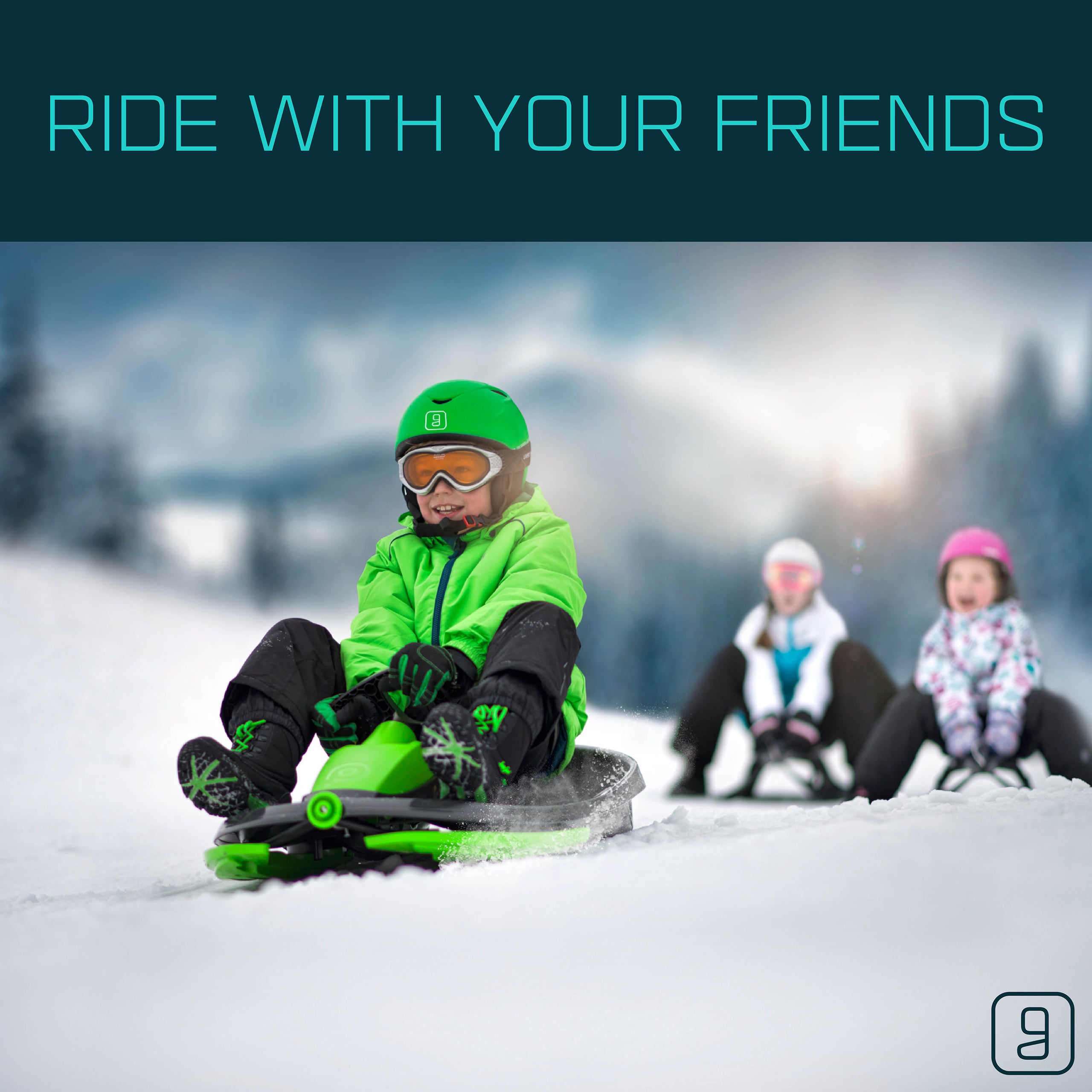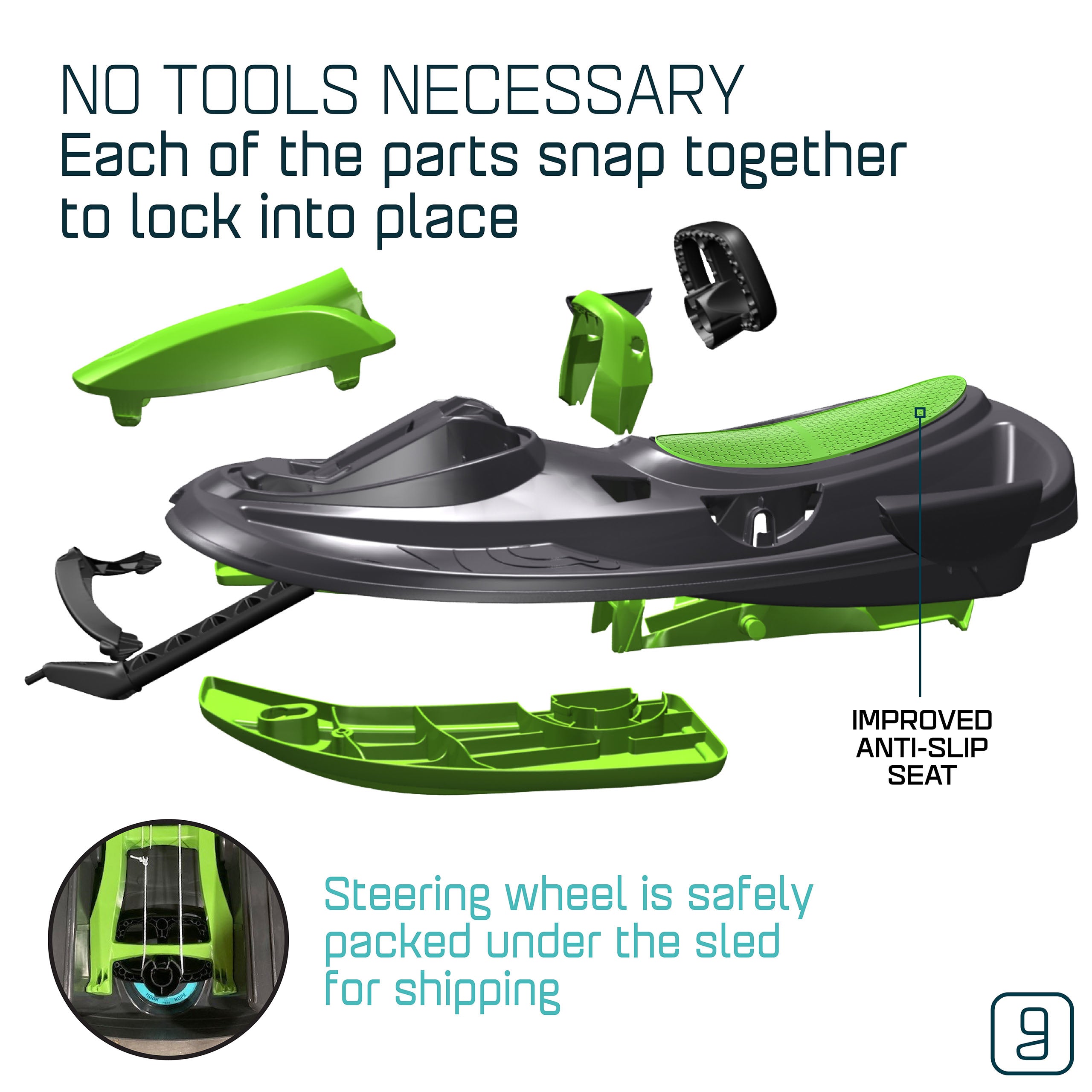 The Gizmo Riders Nimbus snow bobsled for kids can fit up to 2 riders and has been built with speed and handling in mind. The Nimbus bobsled features a steering wheel connected to a locking differential steering system that provides the Nimbus with the ability to maintain high speeds during turns in winter conditions and features a spring-loaded brake that can be activated by simply pulling the brake handle. The Nimbus sled is easily assembled with no tools as each of the parts snap together and securely lock into place. Also featuring a retractable tow rope and anti-slip plastic seat, the Gizmo Riders Nimbus is a fun and exciting snow sled for kids ages 3 and up!