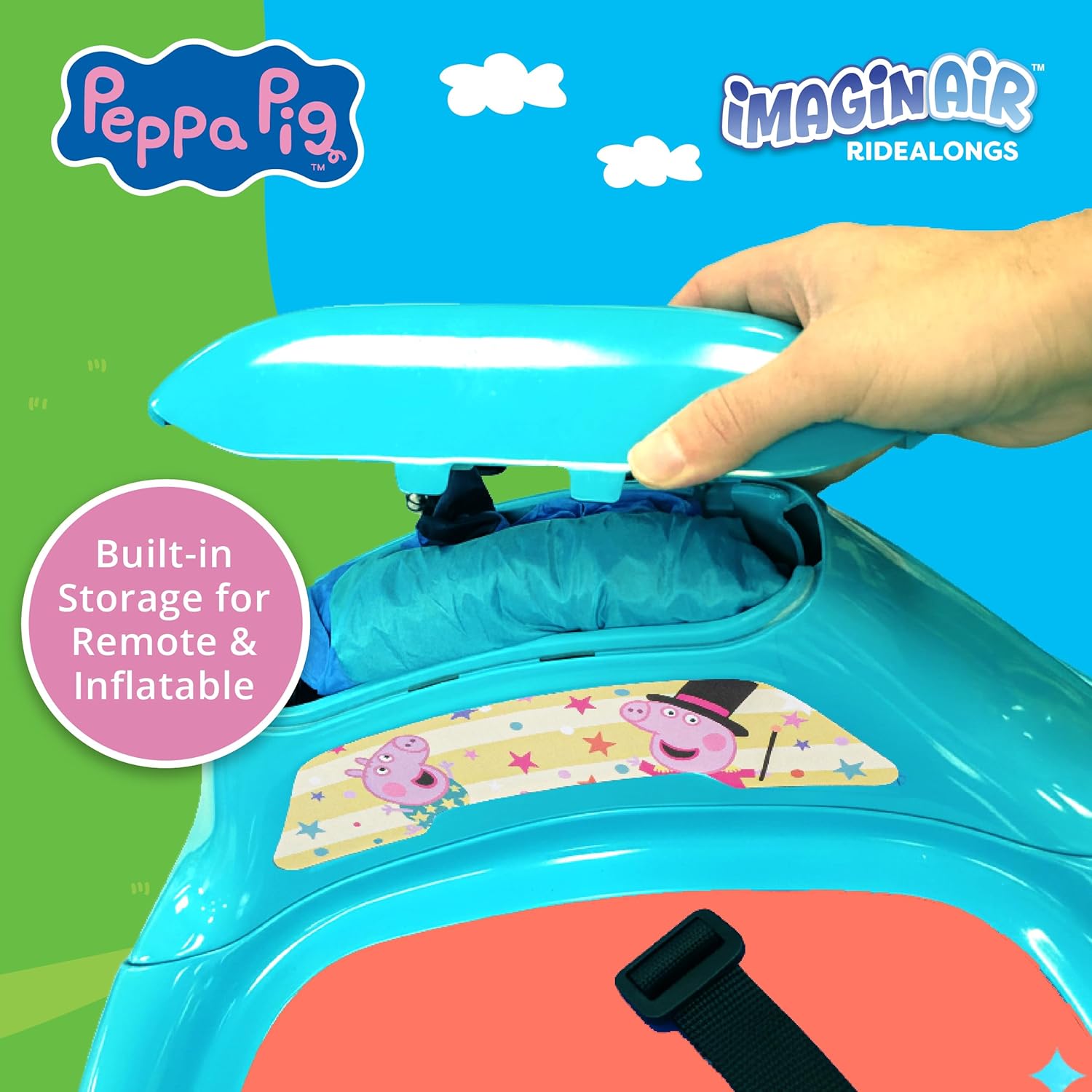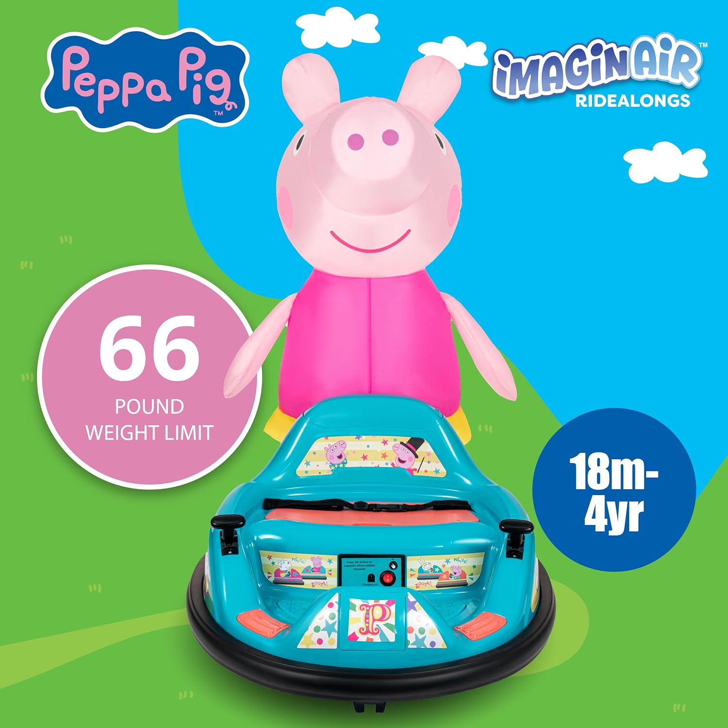 🎈 UNIQUE INFLATABLE DESIGNS WITH AUTO-INFLATE BUTTON – The ImaginAir 6V Bumper Car Peppa Pig toys Ride On ordinary play into extraordinary adventures. With inflatable character covers in fun themes and a convenient auto-inflate button with front air fan, setup is quick and easy. Just press, inflate, attach, and let your child enjoy their very own magical toddler ride on toy. A must-have for families looking for ride on toys that bring screen-free fun indoors or outdoors.