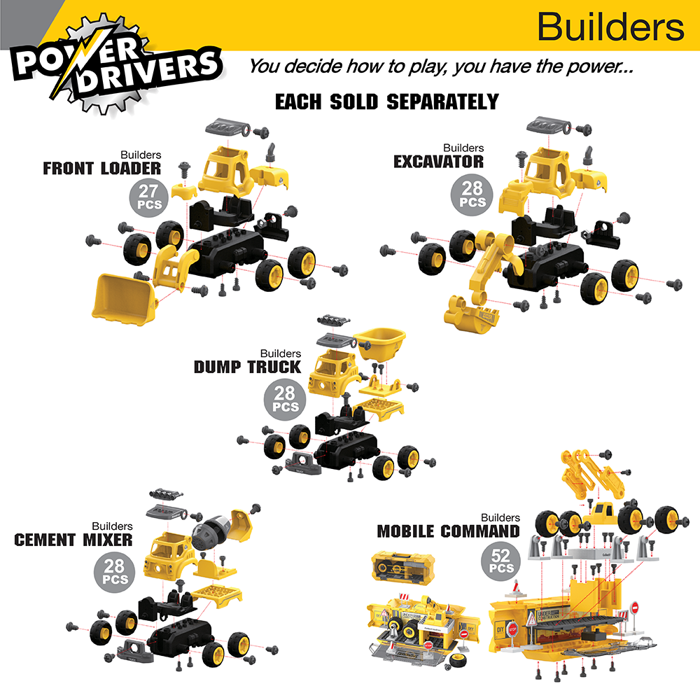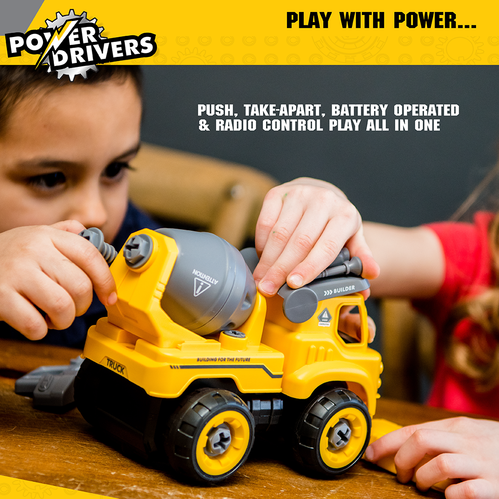 Hear Them! Build Them! Watch Them Go! The Power Drivers collection is fun and engaging for kids ages 3 and up. Easy to assemble multi-part vehicles come in a variety of vehicle models and colors. Assembly and disassembly helps to develop fine motor skills. Three different types of play! Build it using the Power Drill Mode to or Manual Mode. Make it go with the Remote-Control Mode! Lots of fun sounds and a different play experience each time!