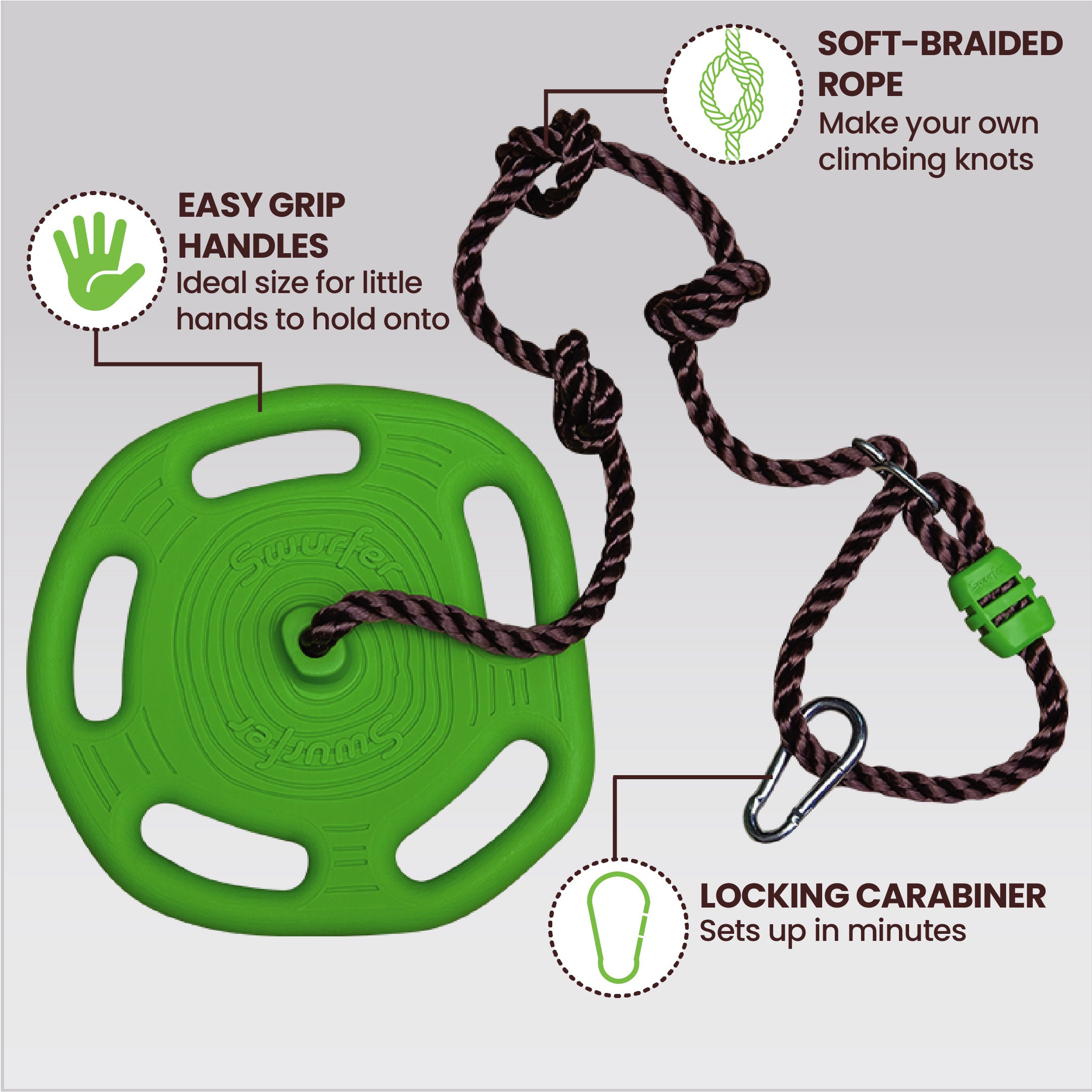 The Tree Ring 3-in-1 Disc Swing is perfect for kids and grown-ups up to 150lbs, to sit, stand, or hang from the handles! Attaches to playsets, swing sets, tree branches, and more! Hang up to 8 feet high.