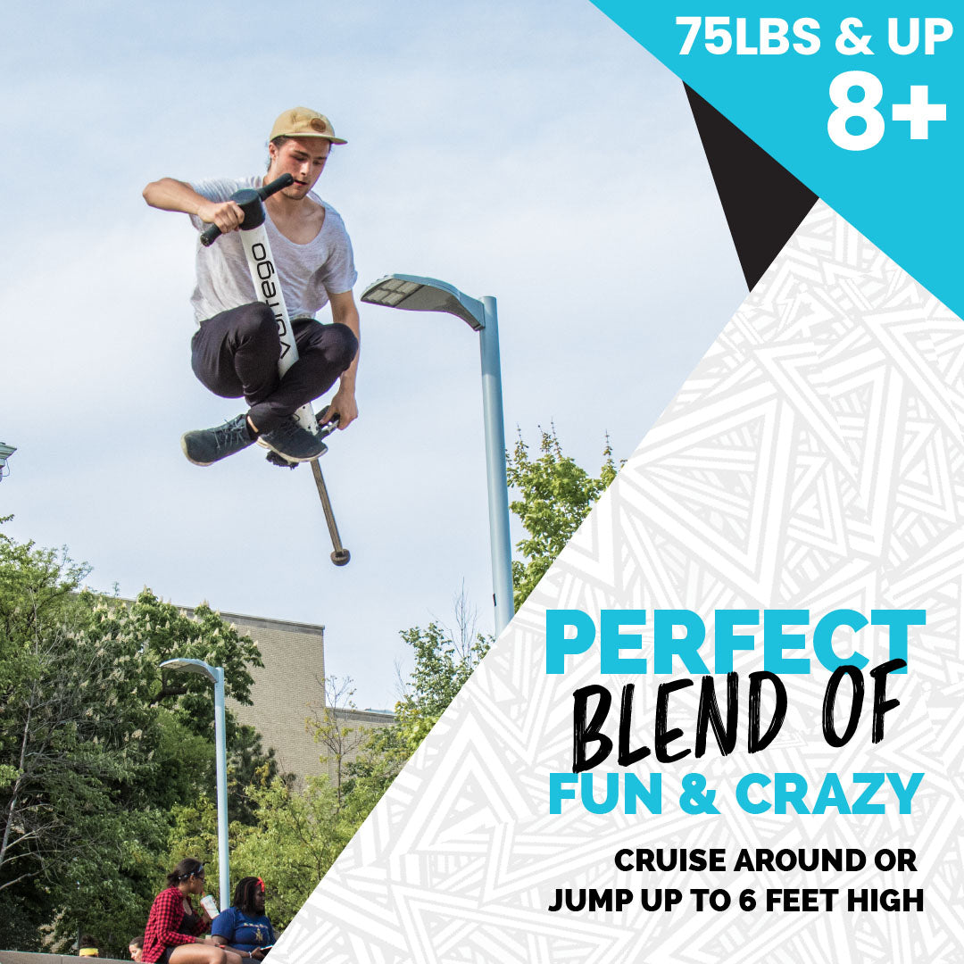 The V4 air pogo stick is designed for riders who weigh 75 pounds or more. For lighter weight riders, please read more here before purchasing. If you still have questions about this extreme pogo stick, shoot us an email and we’ll help out.
