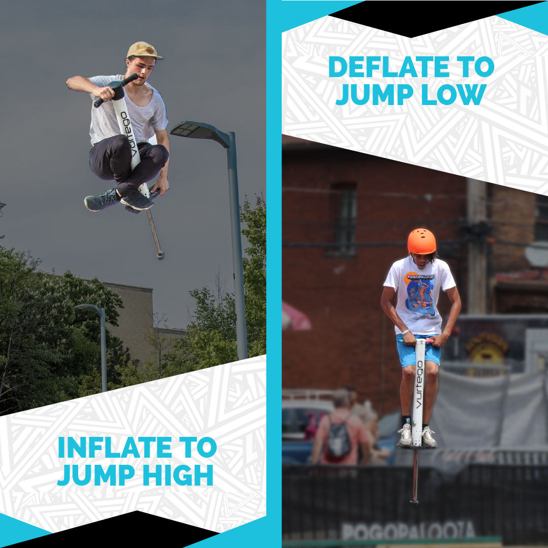 The V4 is our fourth generation air-powered pogo stick. It’s based on the idea of a portable trampoline. You can adjust the air pressure to jump 2 feet high or 6 feet high. The more air you pump into the V4 Pogo Stick, the stiffer the spring will become. The stiffer spring allows you to jump higher than a traditional pogo stick—much higher.