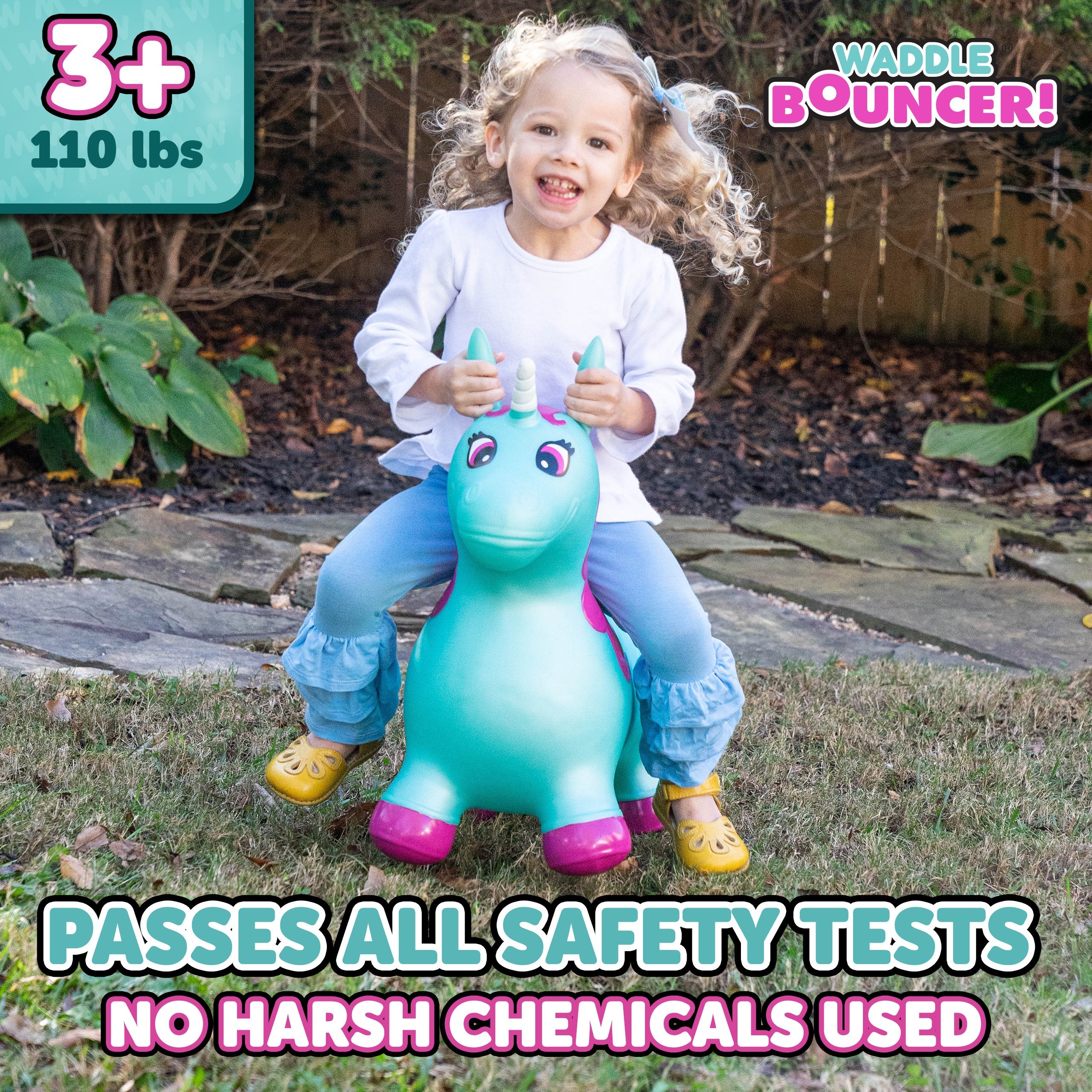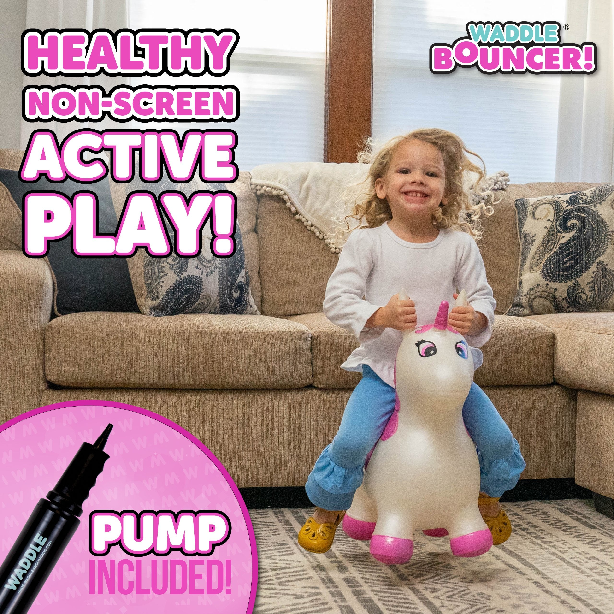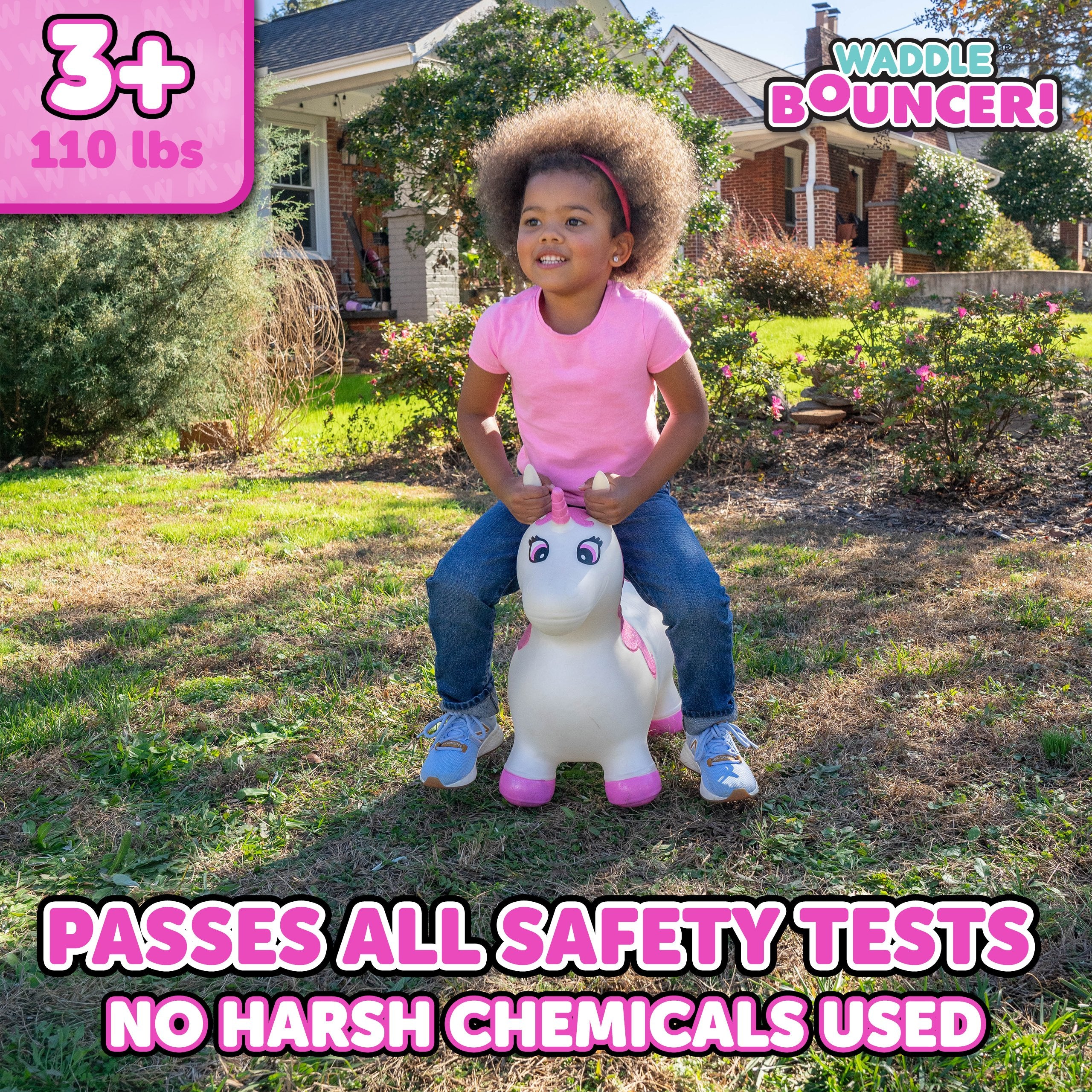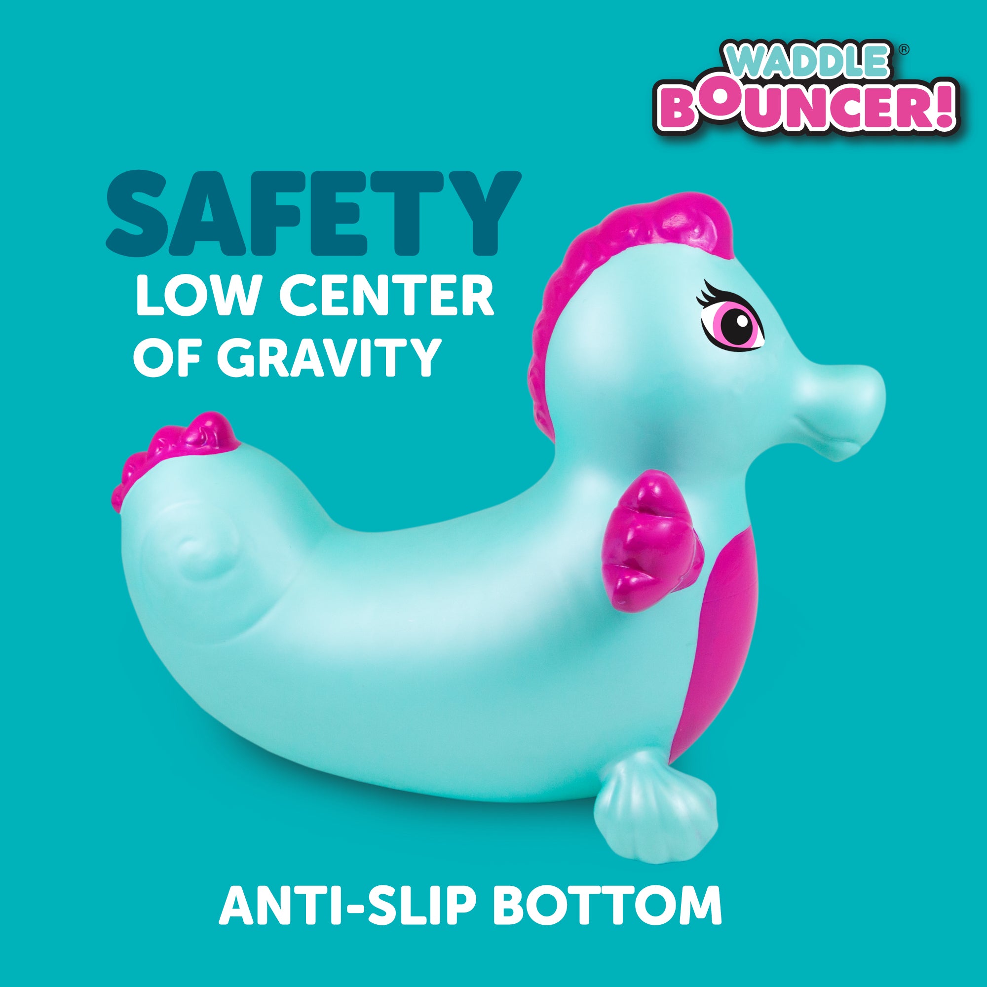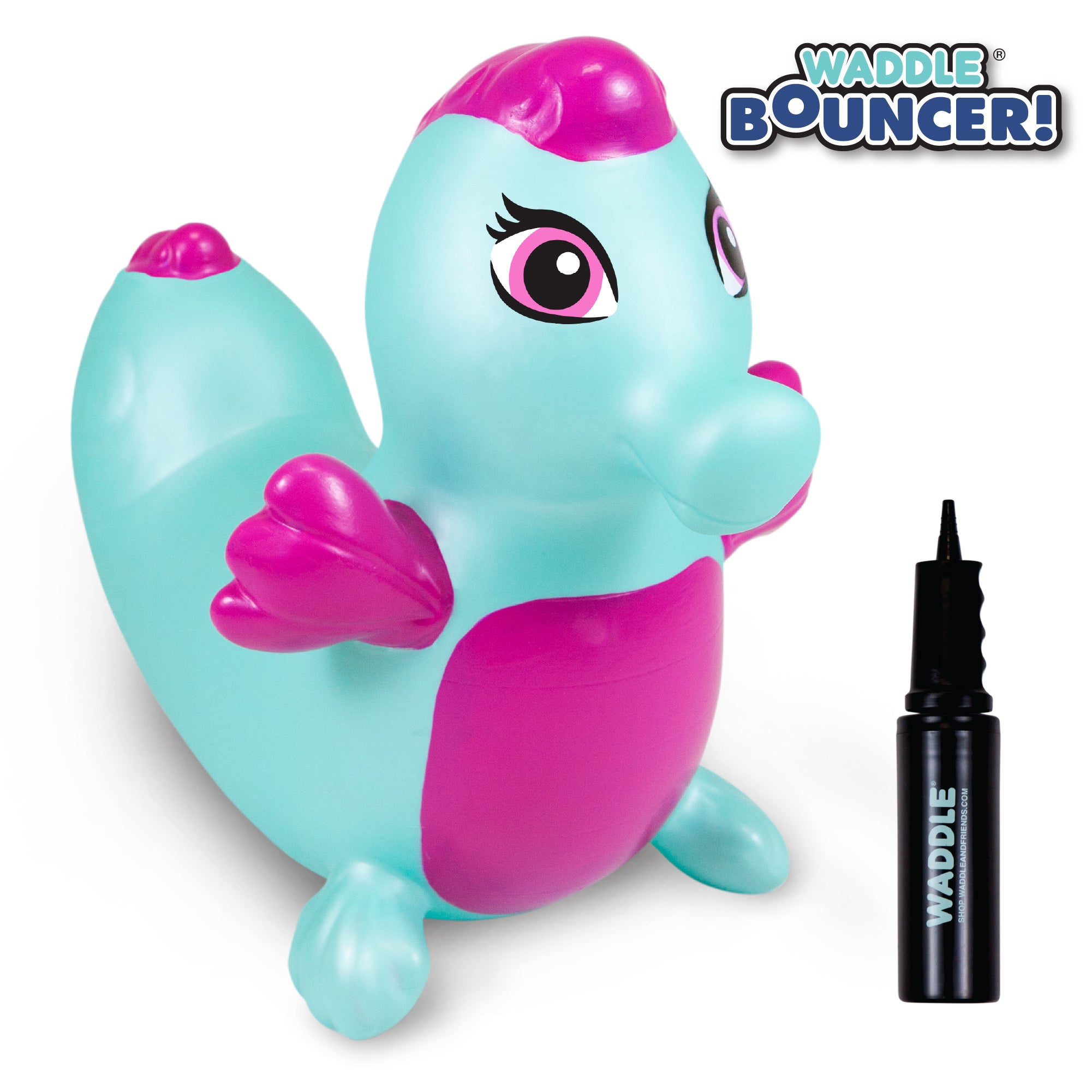 The Waddle Bouncy Hoppers are whimsical fun and perfect for little one’s development! Babies, toddlers, and older children can enjoy improving their skills, muscles, and balance. Durable, kid-safe material makes it safe for active children to enjoy. Features a stable design and easy grips. Pump included. For up to 110lbs.