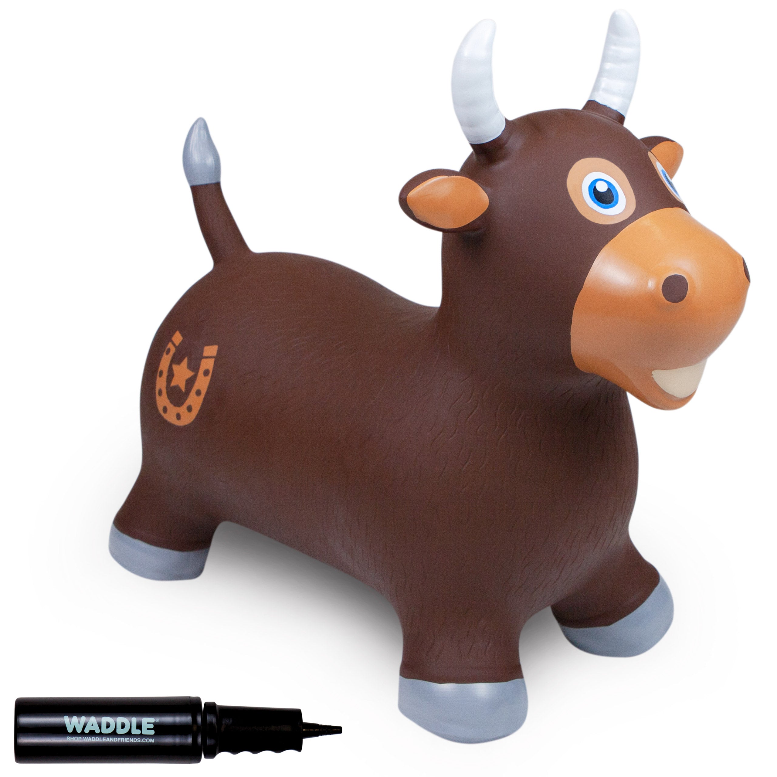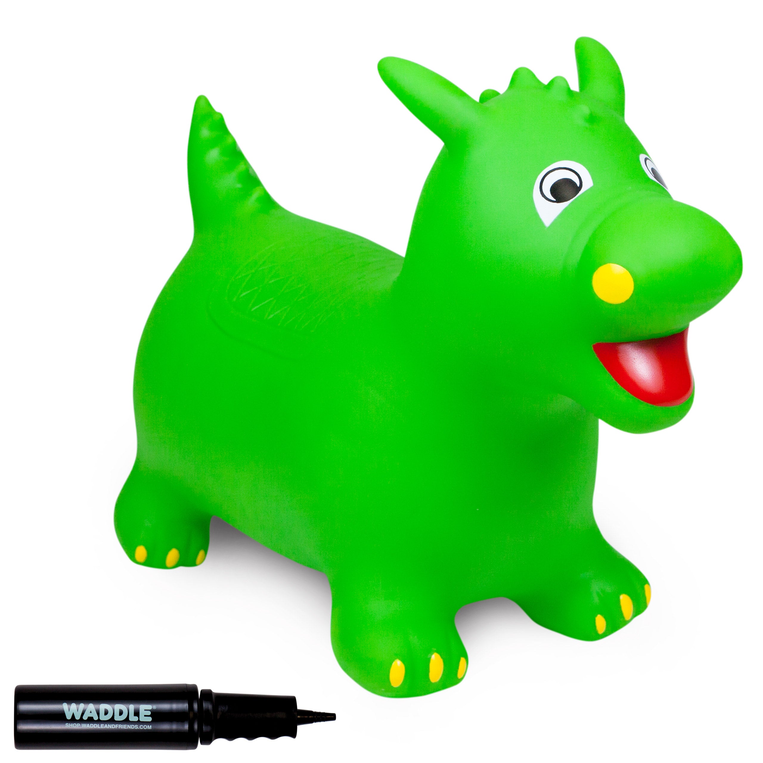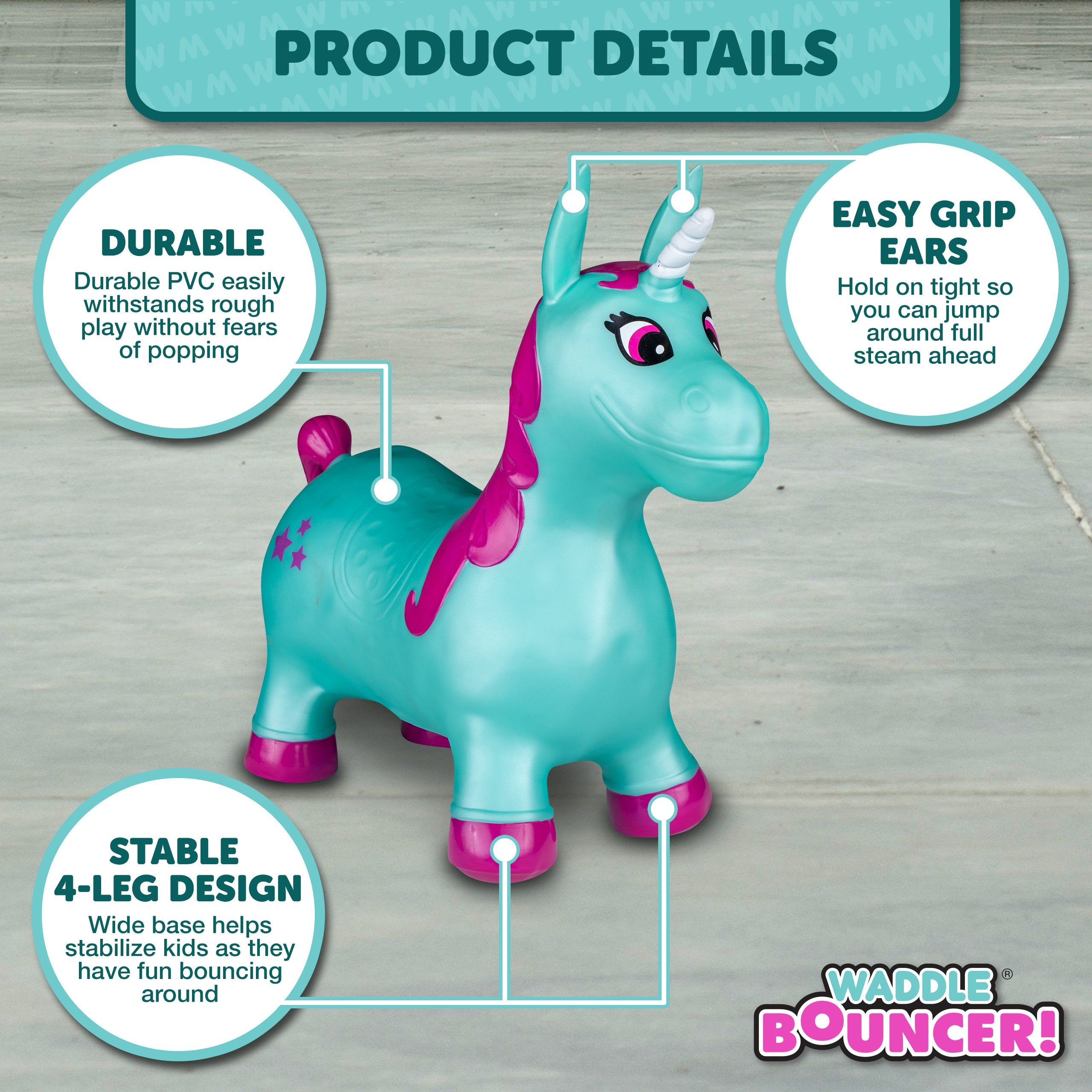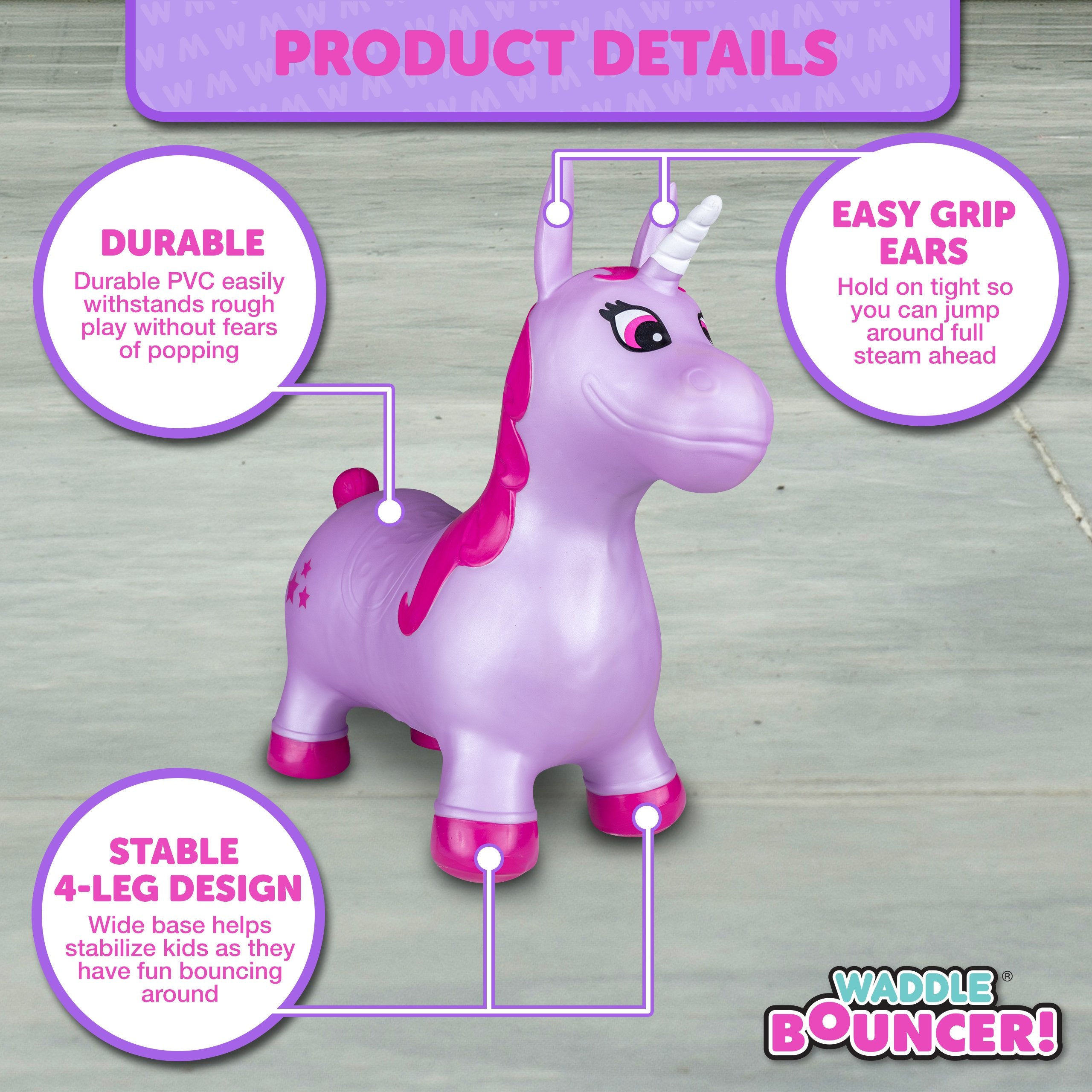 The Waddle Bouncy Hoppers are whimsical fun and perfect for little one’s development! Babies, toddlers, and older children can enjoy improving their skills, muscles, and balance. Durable, kid-safe material makes it safe for active children to enjoy. Features a stable design and easy grips. Pump included. For up to 110lbs.