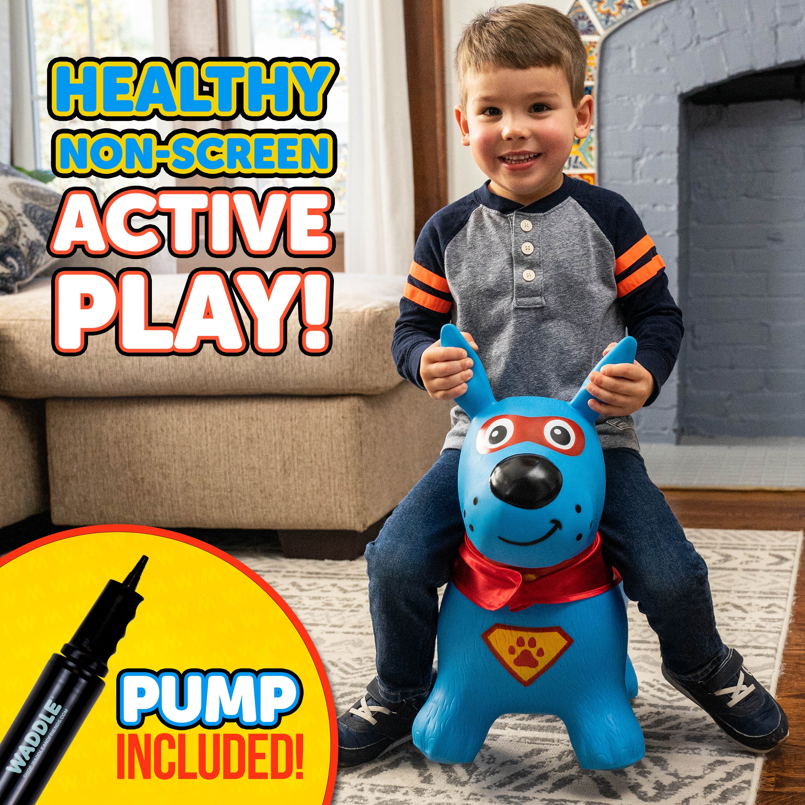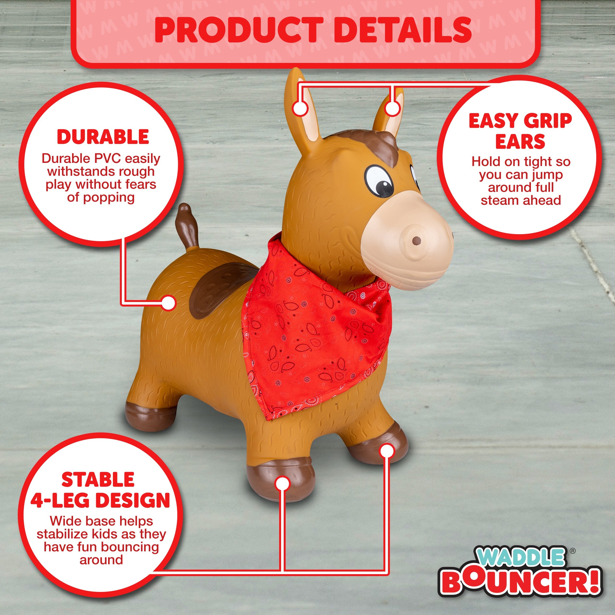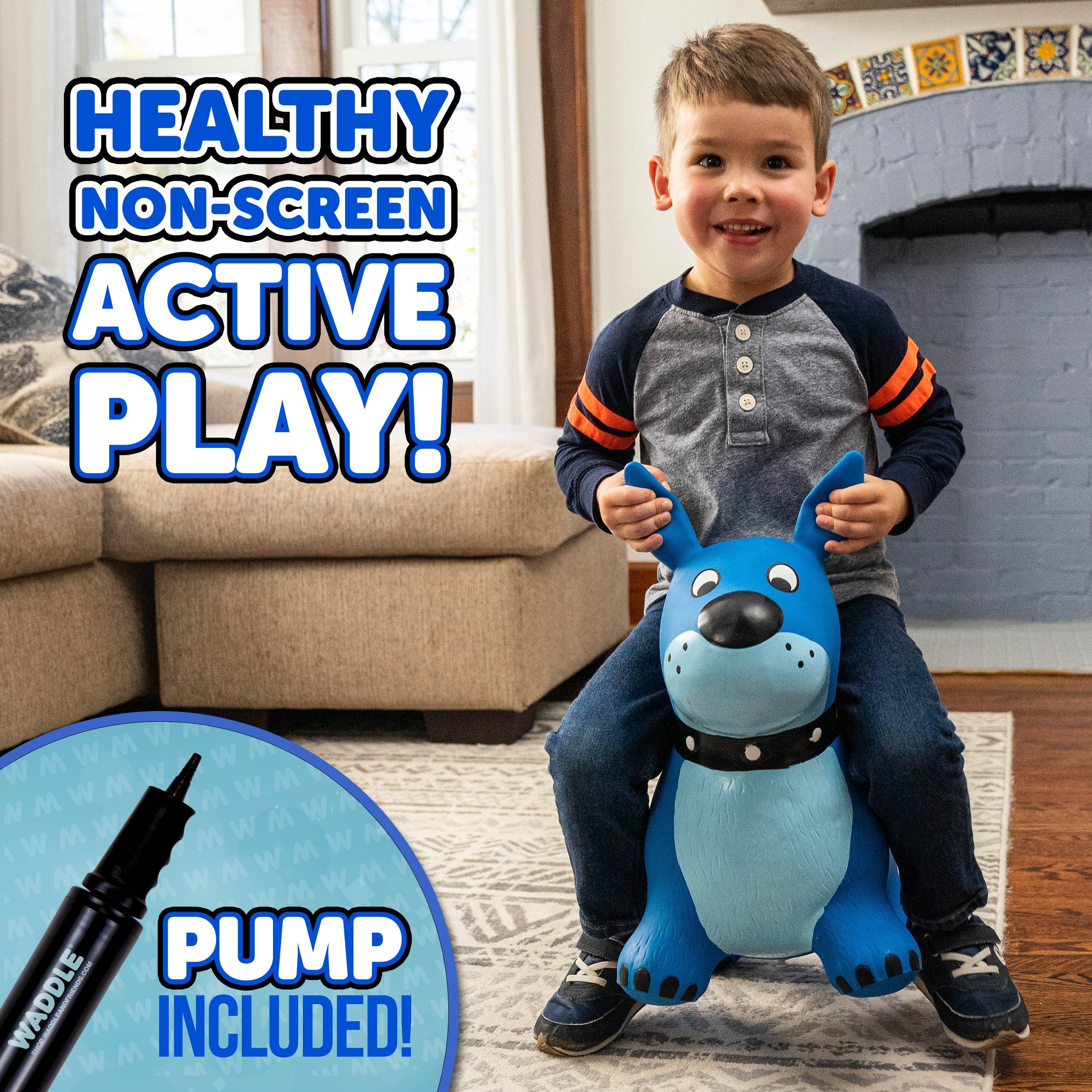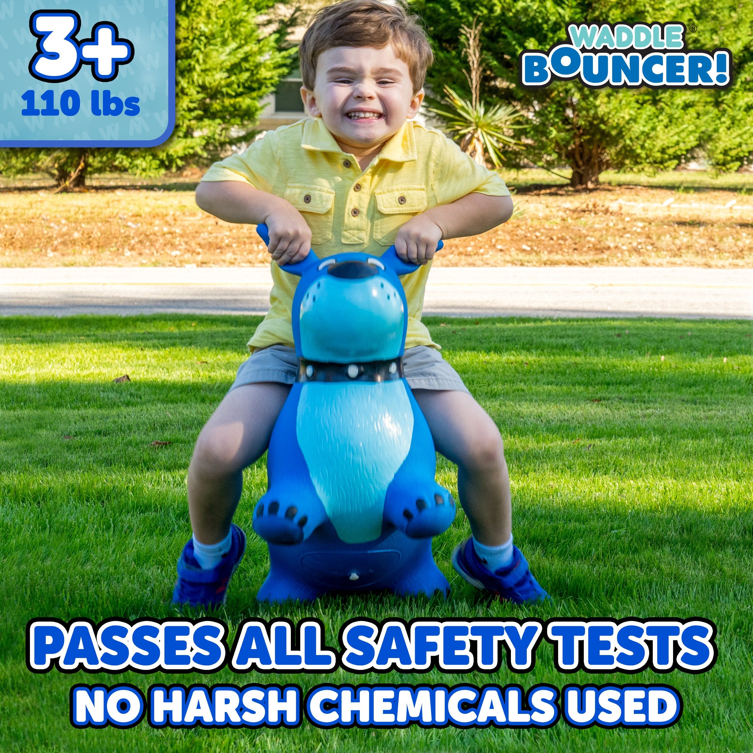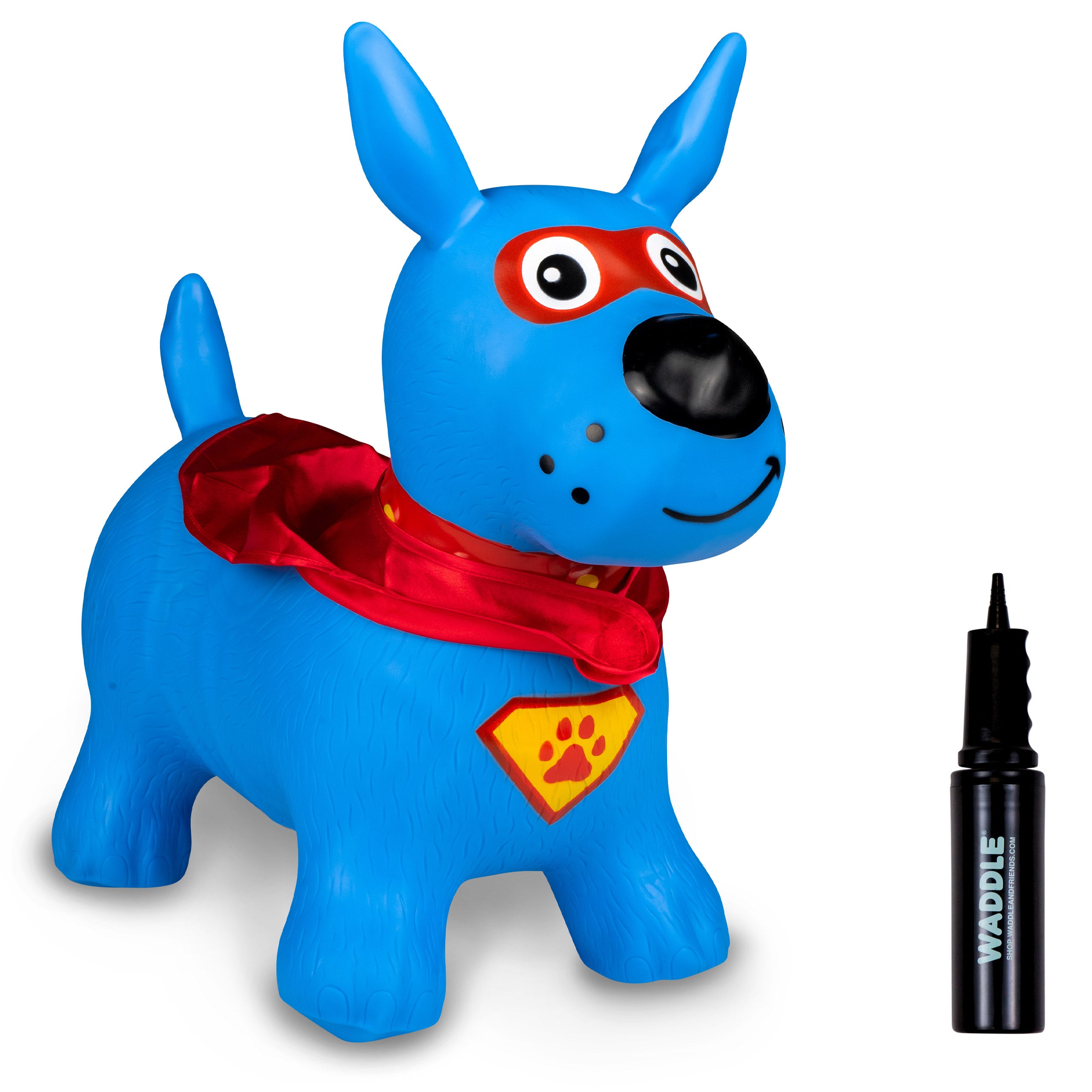 The Waddle Bouncy Hoppers are whimsical fun and perfect for little one’s development! Babies, toddlers, and older children can enjoy improving their skills, muscles, and balance. Durable, kid-safe material makes it safe for active children to enjoy. Features a stable design and easy grips. Pump included. For up to 110lbs.