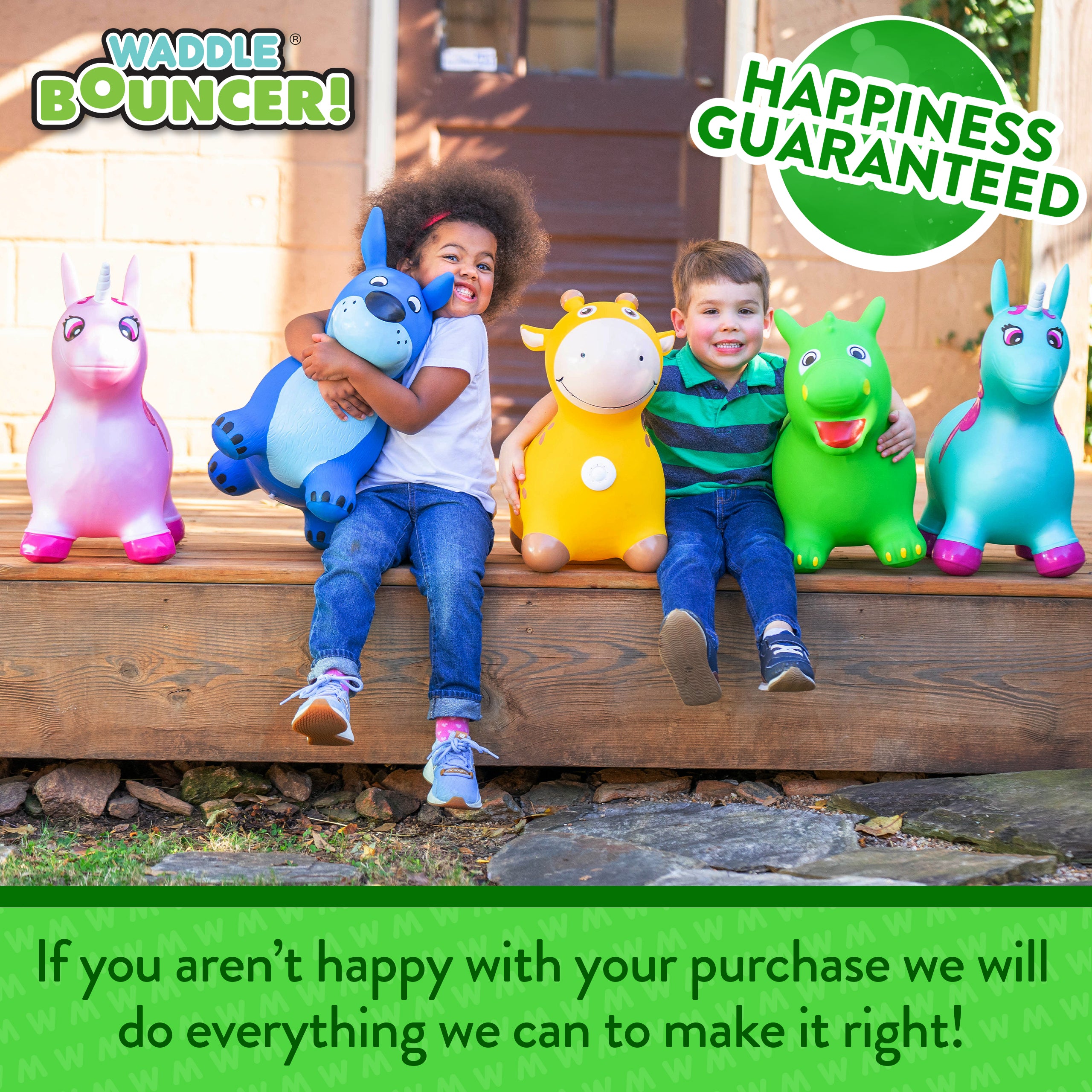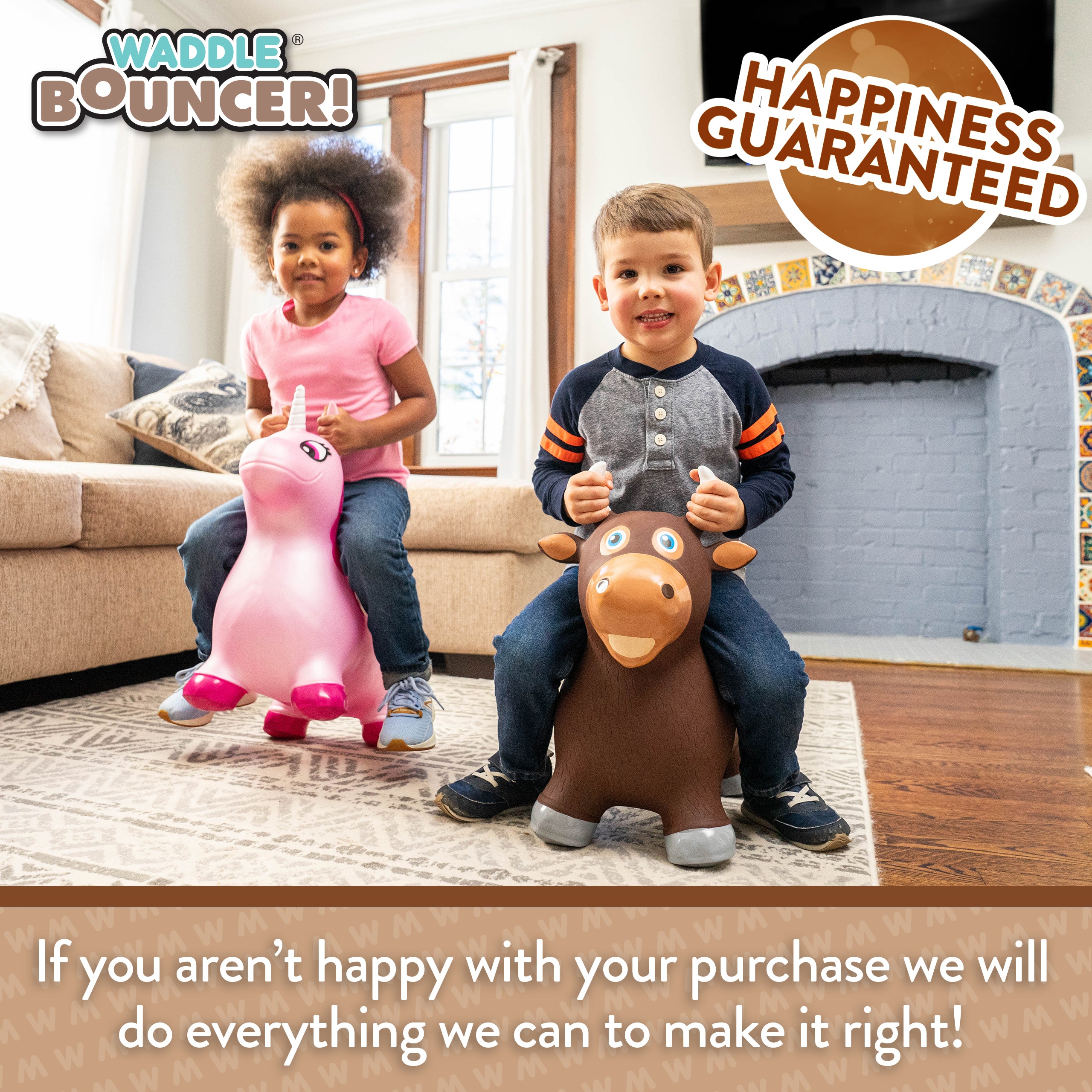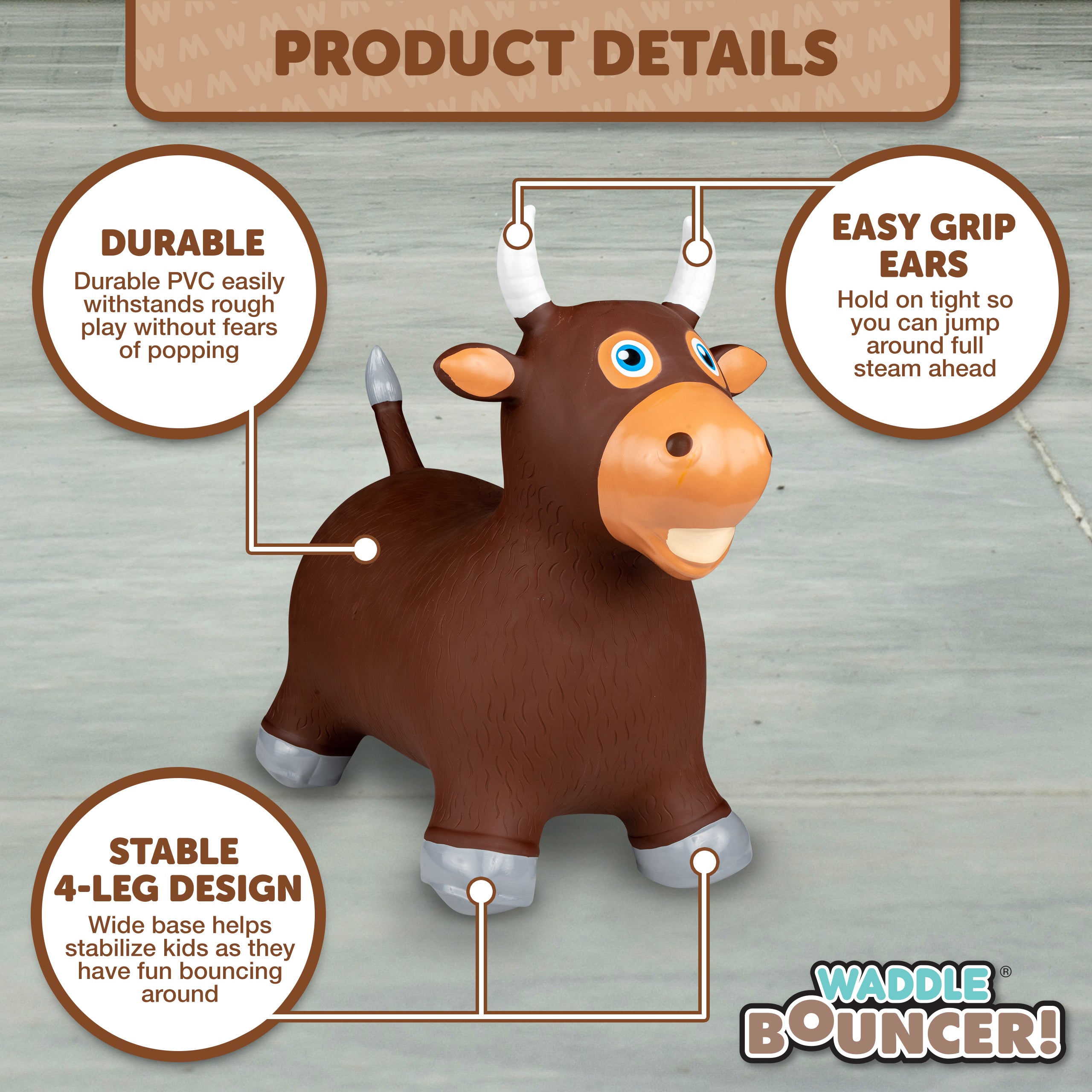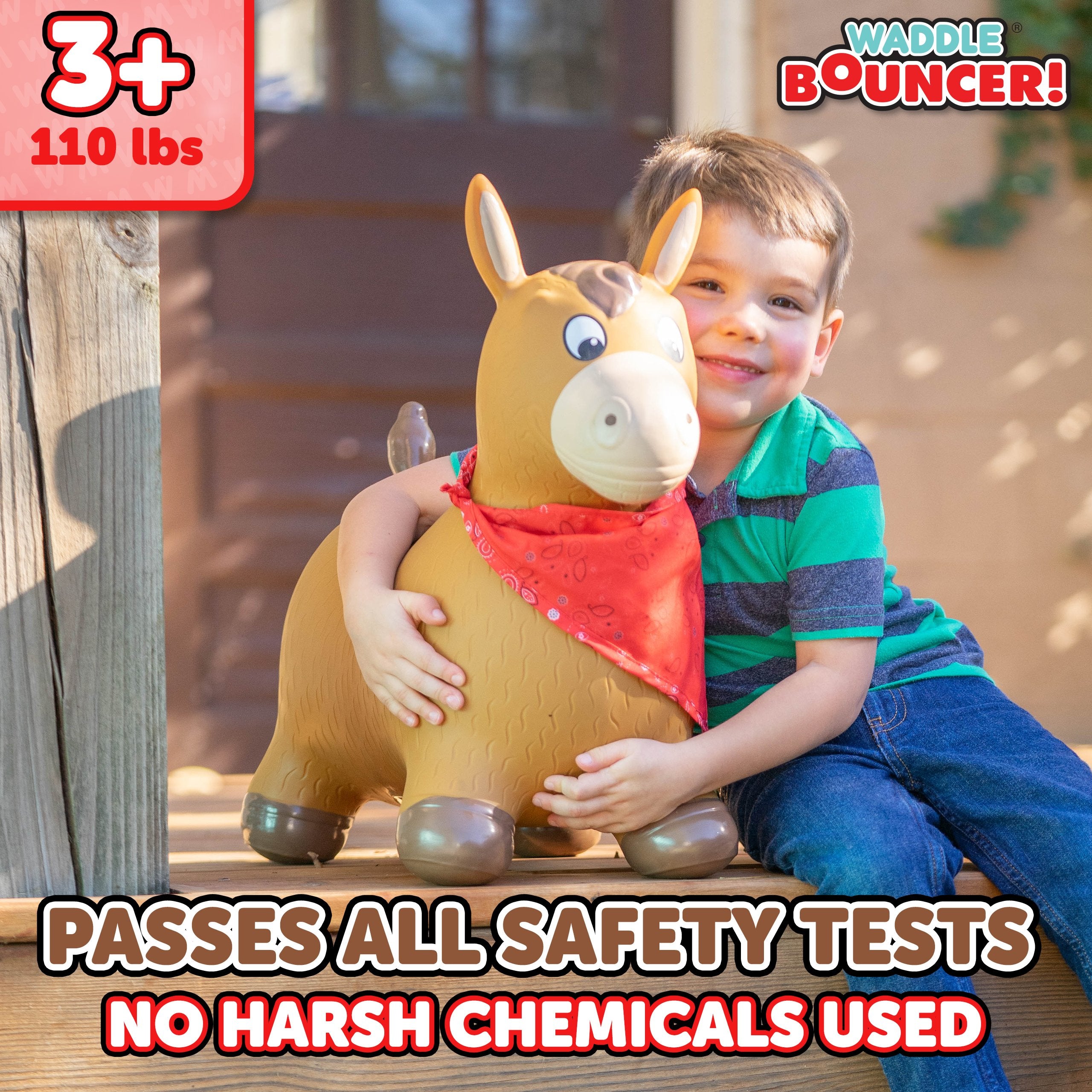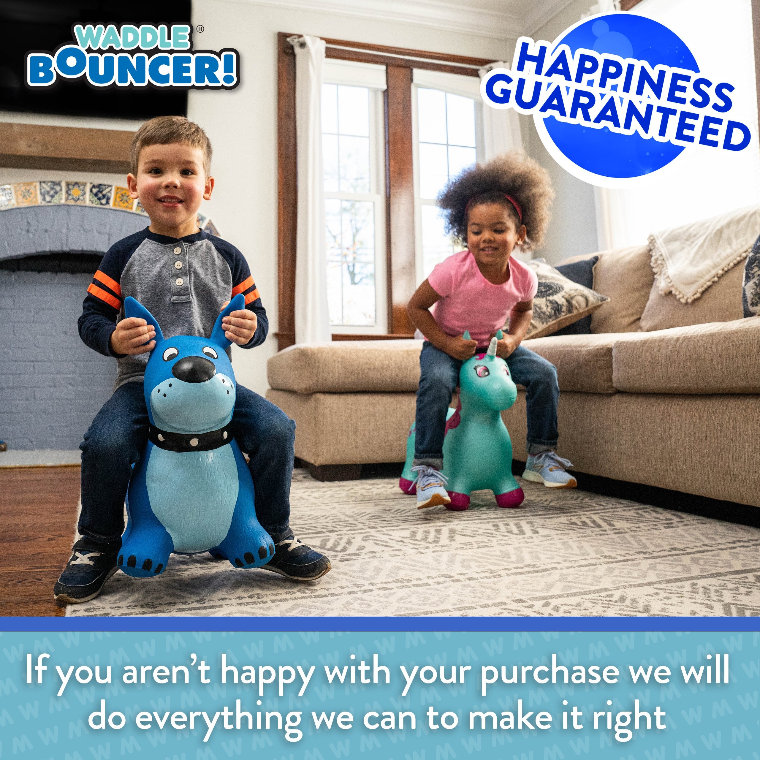 The Waddle Bouncy Hoppers are whimsical fun and perfect for little one’s development! Babies, toddlers, and older children can enjoy improving their skills, muscles, and balance. Durable, kid-safe material makes it safe for active children to enjoy. Features a stable design and easy grips. Pump included. For up to 110lbs.